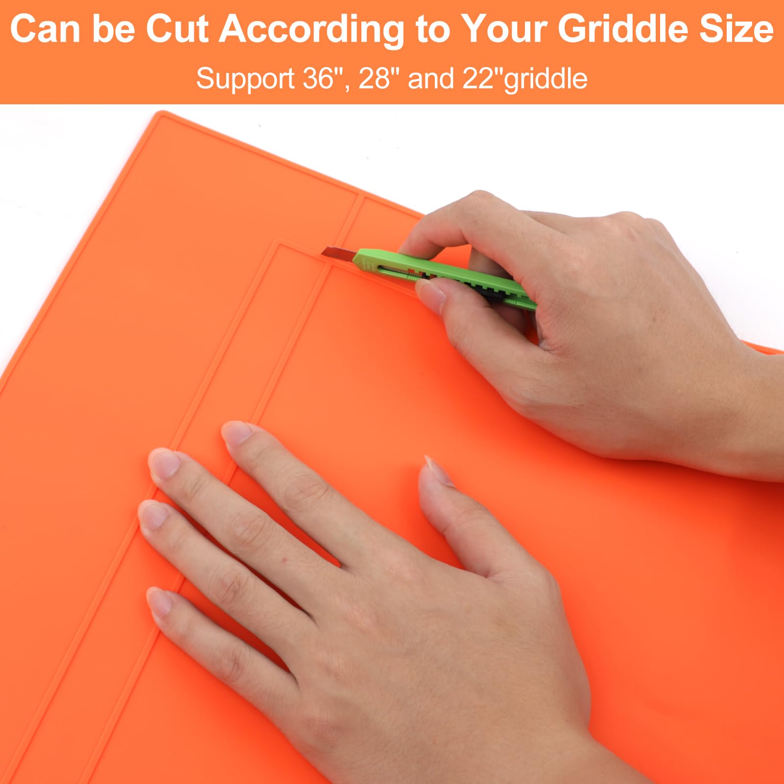 - ✅【Cuttable Design】You can cut this silicone griddle mat for blackstone to your desired size 36inch/28inch/22inch according to your needs. The Cuttable Griddle Grill Mat No need to worry about the wrong size, very easy to use. All-Year-Round Griddle Guard, Give your griddle full-time protection against dust, and rust with our robust silicone grill cover.