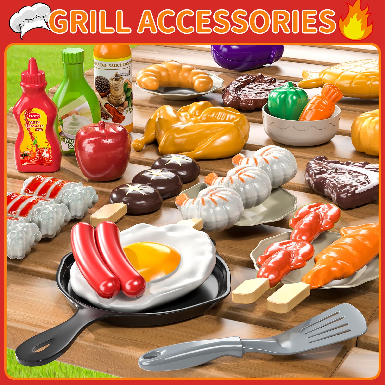 - 【Deluxe Double-Layer Grill Set】Ignite culinary creativity with this BLmukce kids kitchen playset featuring a 2-tier grill, charcoal, utensils, plates, 3 DIY sauces, and 20+ play foods. This toy is specially designed for 3 4 5 6 Years Old Boys and Girls, this kids grill playset offers endless pretend BBQ fun indoors or outdoors.