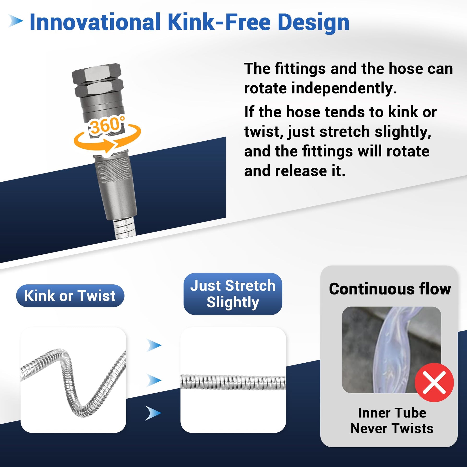 - No more time-waste on dealing with the kinks: No matter where you maneuver around trees and other obstacles, there won't be those annoying kinks and twists. Our hose comes with our exclusive Kink-Free Design. When the hose tends to kink, just stretch slightly, the fittings can easily rotate to release it. Reduced friction between inner tube and outer steel cover, protects the inner tube from cracking caused by wear and tear