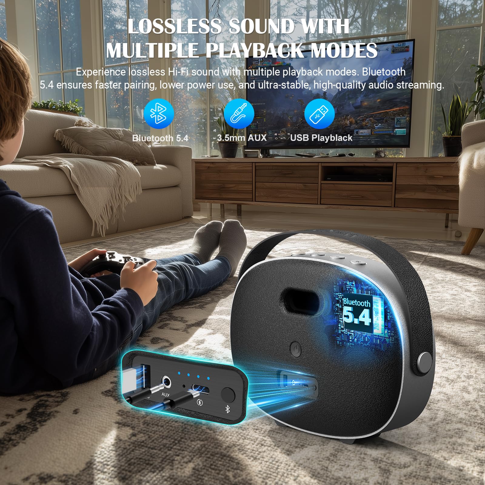 - PORTABLE HANDLE, INDICATOR LIGHTING: W-KING T8II bluetooth boombox features a lightweight design for easy portability. Whether gardening, cycling, camping, or hosting parties and events, it fits seamlessly into any scene. The portable handle and non-slip foot pads ensure stable placement and secure grip. The T8II large speaker delivers high-quality mobile sound, adding rhythm and atmosphere to daily life. The indicator light design can provide better feedback at every step of the music action!