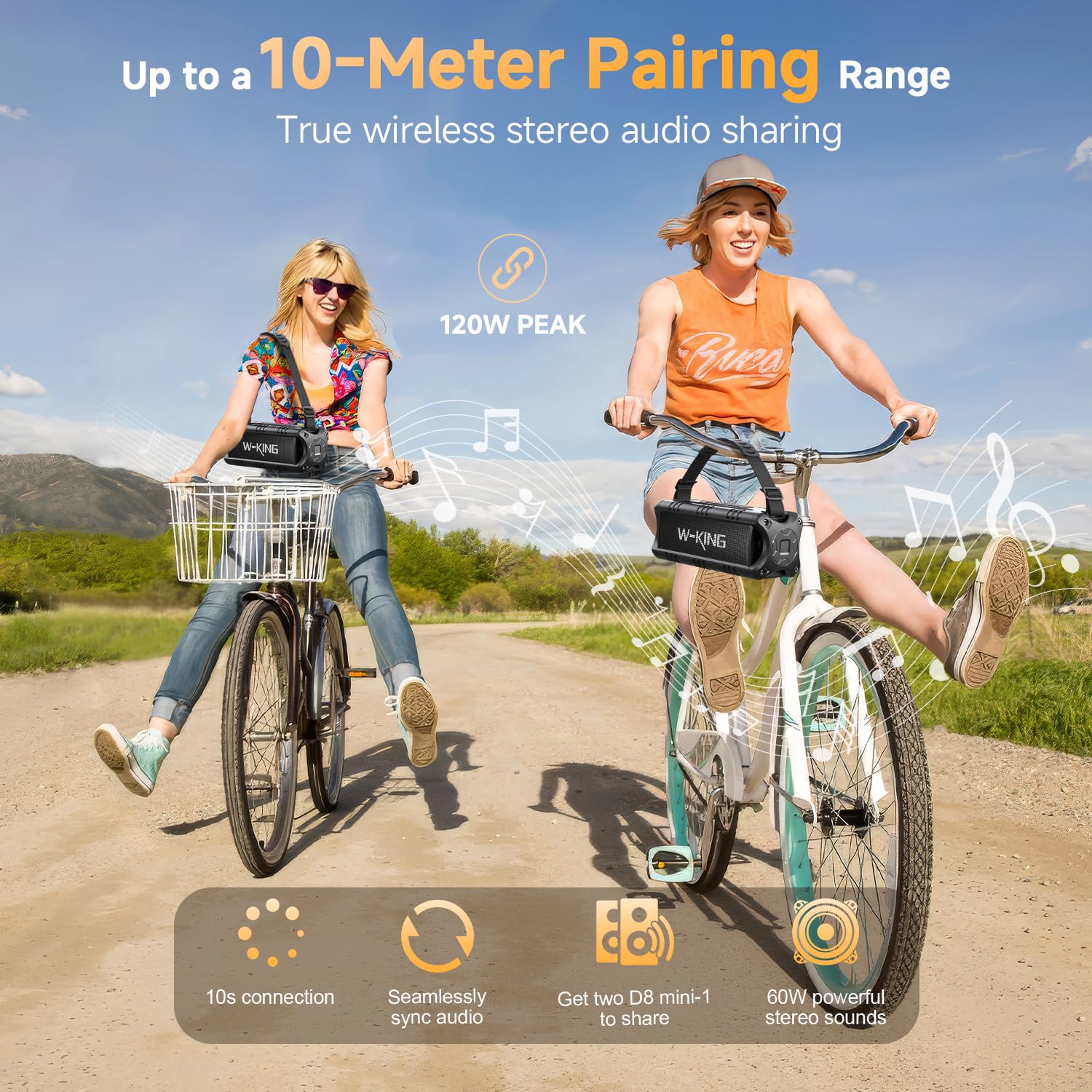 - WATERPROOF IPX6 & POWERFUL STEREO SOUND: W-KING waterproof outdoor Bluetooth speaker is IPX6 certified to resist gentle water spray & splash but cannot be partially or fully submerged. It’s perfect for splash-proof, rainproof, dust-proof, sand-proof, etc. Connect two W-KING D8 MINI-1 portable speakers wireless bluetooth at the same time, you can get a 30W superl surround sound effects, and enjoy a better music feast!