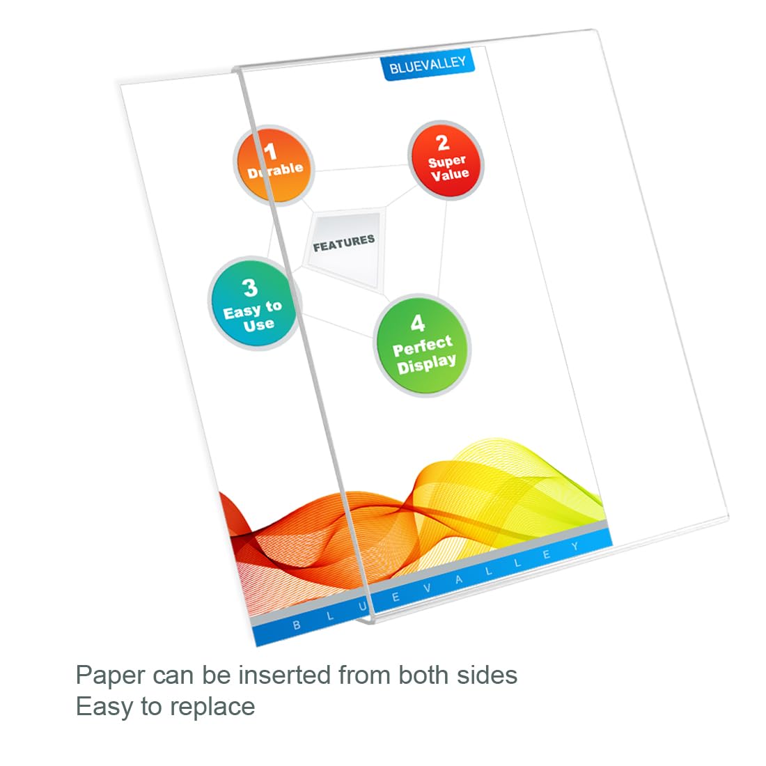 - 【Top Acrylic & Slant-Back Display Stand】Crafted from crystal clear acrylic board, BlueValley tabletop acrylic display stands are mordern, lightweight and sturdy. Ideal for various locations like offices, homes, retail stores, conference, craft or vendor fairs. The side-loading feature accommodates portrait standard 8 1/2 x 11 inch paper, flyers, letter size document or A4 photos, serving as effective pictures or certificates protectors against water and dust.
