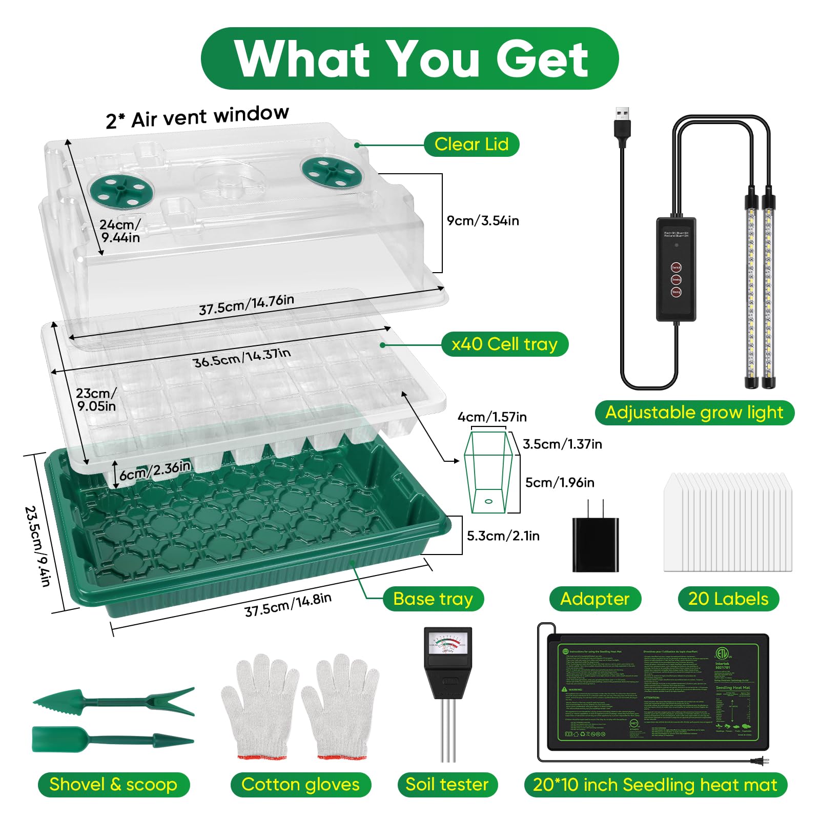 BlumWay 4-in-1 Seed Starter Tray with Grow Light &Heat Mat & Soil Meter Set,40-Cells Seedling Tray with Humidity Dome for Indoor Plant