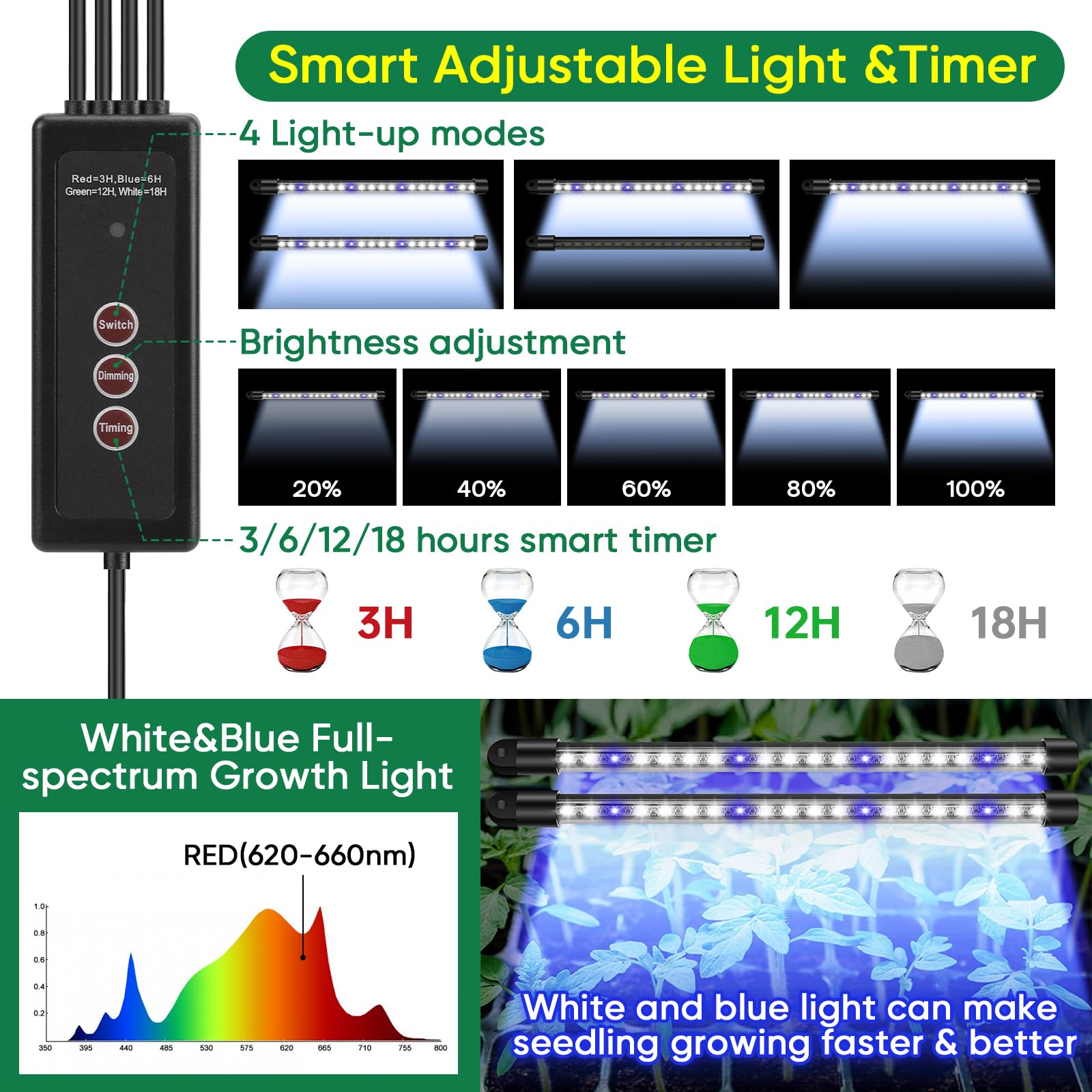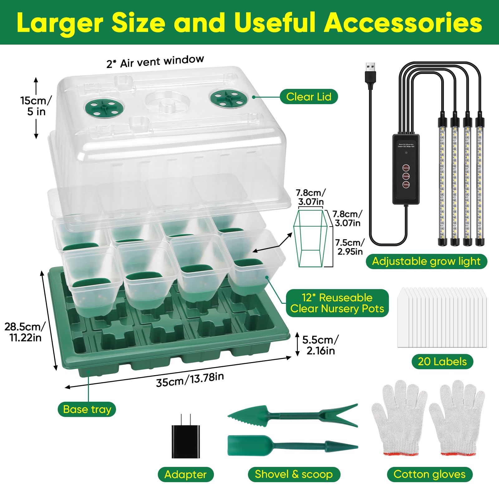 - 【360°Spectrum Grow Light】 Larger grow light cover spectrum for better seedling grow, this product has upgraded 4 full spectrum strip plant growth lights insert on the Dome of the plant starter kit, and also has improve the light. Now you can adjust and timed the light as you need, you don’t have to stay at home ! White& blue Light will help seedling growing faster and better. You can use this product by USB port or just plug-in,3 lighting modes & 4 timing functions (3H/6H/12H/18H) & 5 brightness modes, providing a better garden tool for anyone!