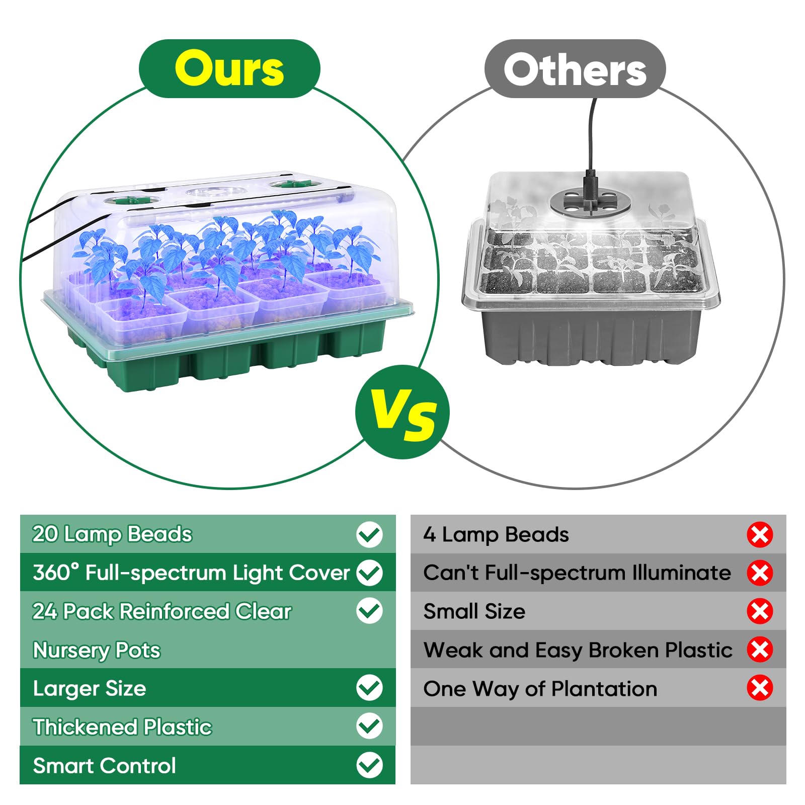 - 【24 Pack Reuseable Clear Nursery Pots,80 Lamp Beads】 Comes with 24 pack clear nursery pots, it is reuseable and made of silicone base which will make the soil come out and transplanted easily. Our lamp beads is numerous, and you can see on the strips,there is 20 pcs on each light, it can fully illuminate on every seeds, spectrum is 360°. It will help houseplant growth healthier and faster.