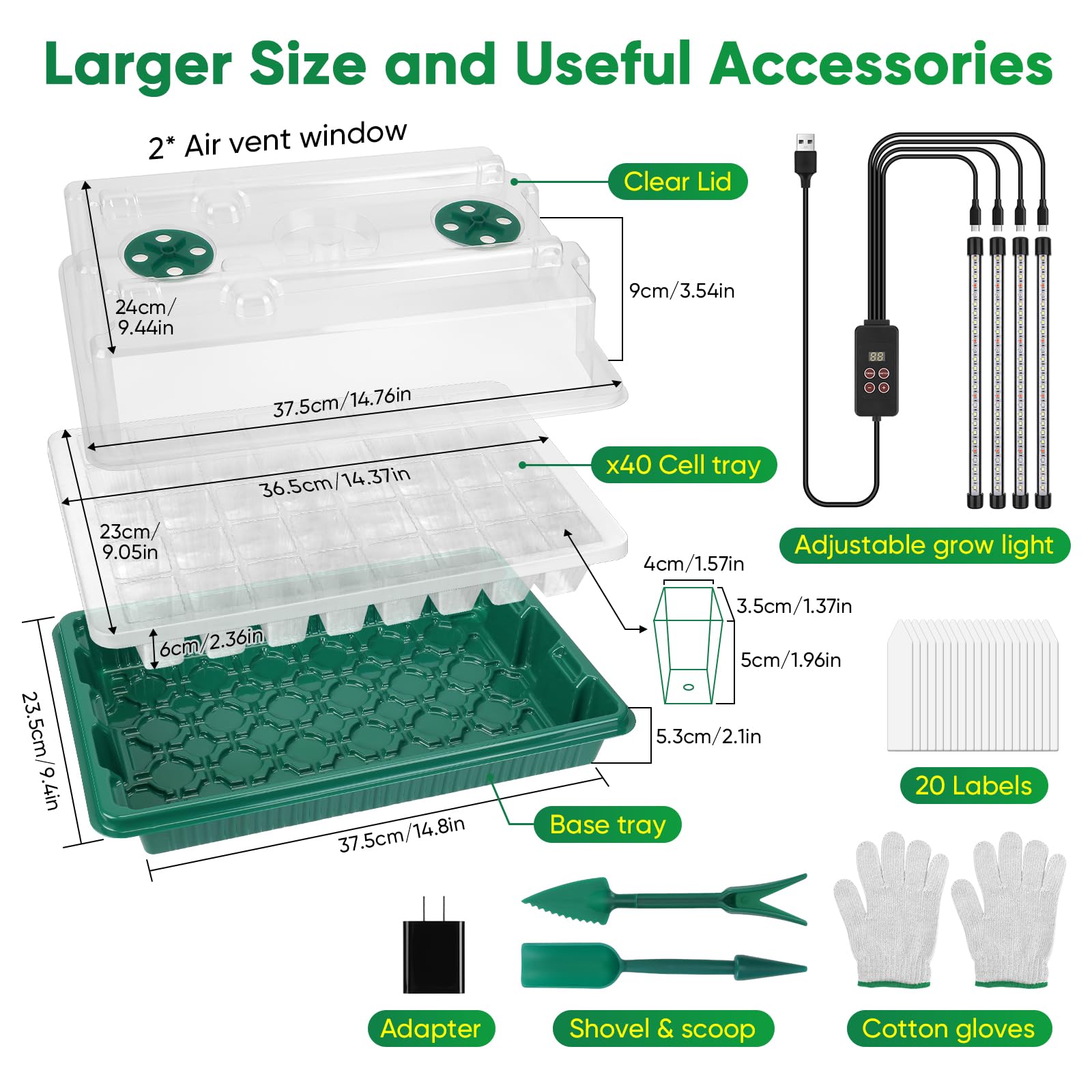 - 【360°Spectrum Grow Light】 Built-in way of grow light cover spectrum for better seedling grow, this product has upgraded 4 full spectrum strip plant growth lights insert on the Dome of the plant starter kit, and also has improve the light. Now you can adjust and timed the light as you need, you don’t have to stay at home ! White& blue&red grow Light will help seedling growing faster and better. You can use this product by USB port or just plug-in,having timing functions (1-24 hours timed ) & 5 brightness modes, providing a better garden tool for anyone!
