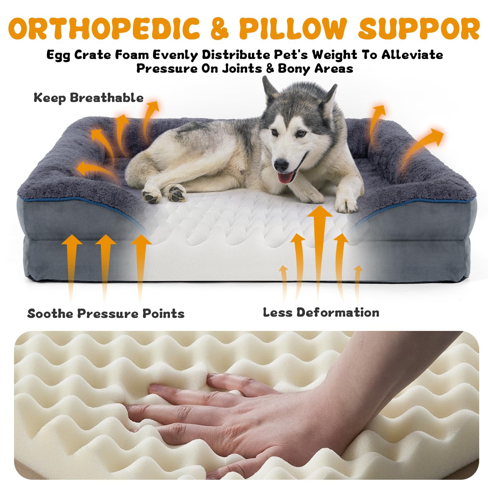 - HIGH-QUALITY MATERIALS: Orthopedic dog bed are made of faux linen fabric, soft-to-touch plush fleece on sleep surface and sturdy duvet cover, egg-crate foam helps cushion pressure points and Provides incredible support and comfortable sleep, and really protects your dog's legs, elbows and hips from pressure from the floor.