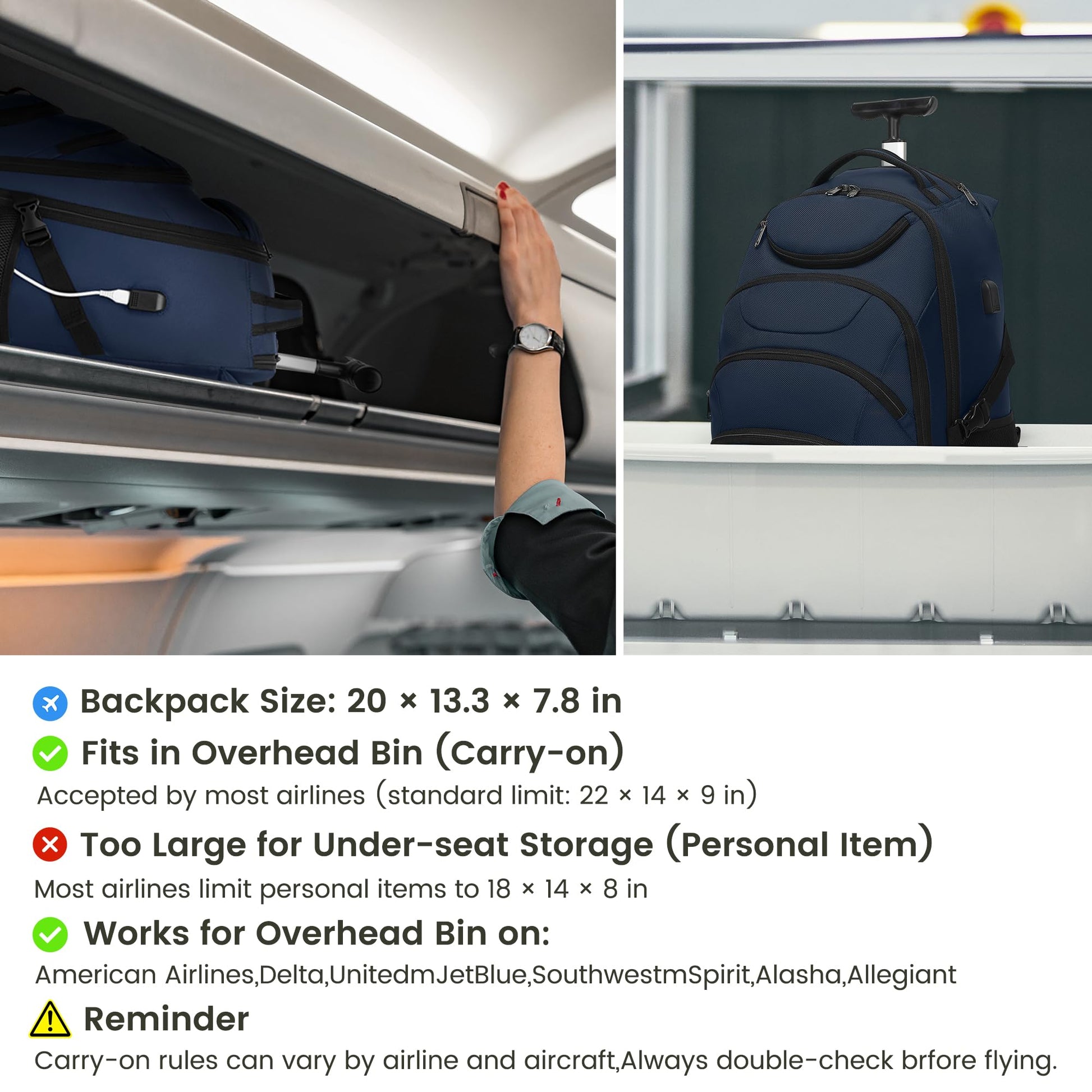 - Travel Companion: This backpack with wheels is convenient for security checks, it is designed to meet most airline carry-on baggage requirements and fits easily into the overhead rack. Its multi-purpose design provides convenience for student parties and business travelers, this classic multi-functional backpack is the best choice for students and travelers for roller backpacks, college student backpacks with wheels, and business rolling backpacks