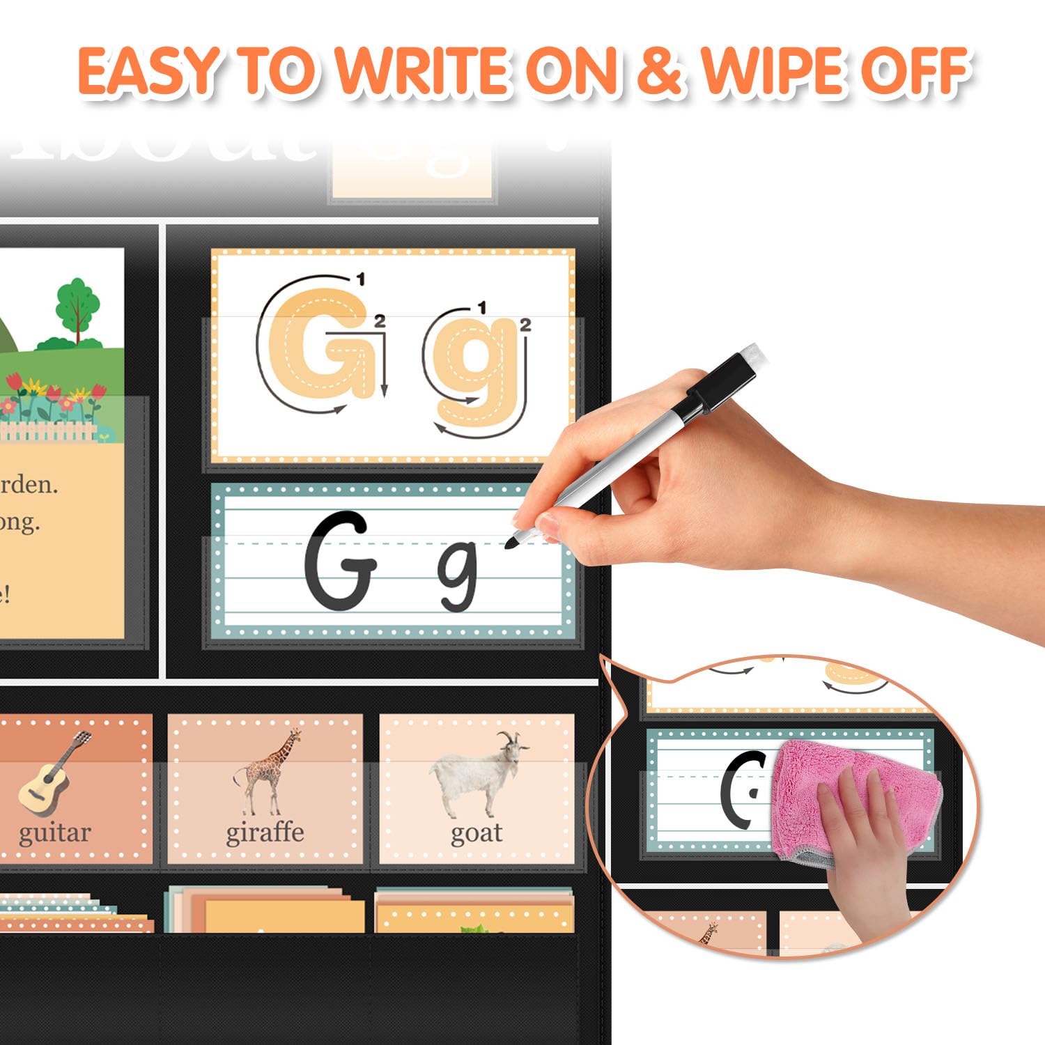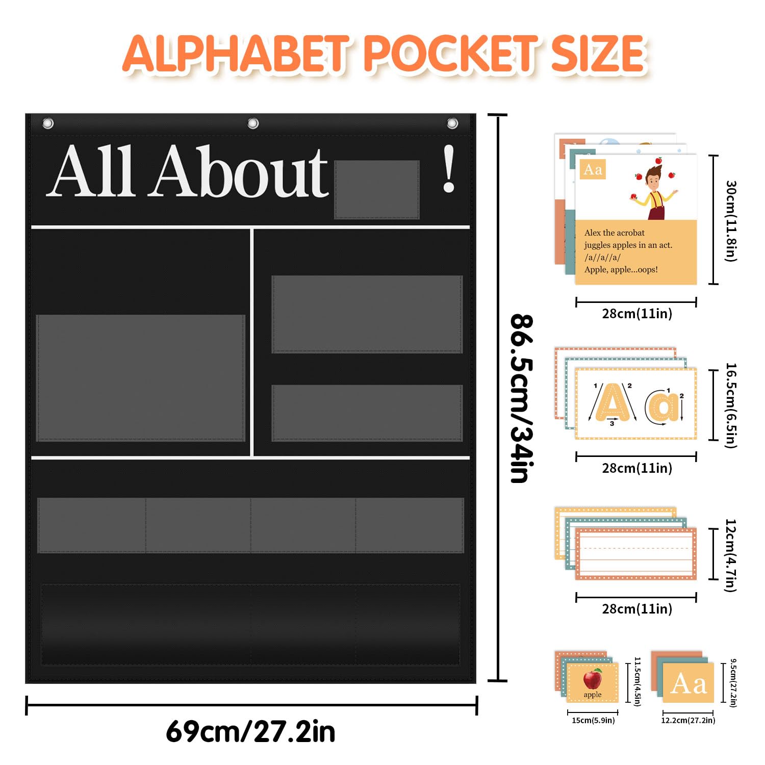 - 【PROVIDES ALL-ROUND LEARNING OF LETTERS】 - This all about letters pocket chart gives children the necessary practice of letters from A to Z through a hands-on interactive mode. Bright colors and vivid images make teaching intuitive and easy. Makes teaching letters, letter sounds, letter shapes, calligraphy and letter poems a fun and easy way to teach