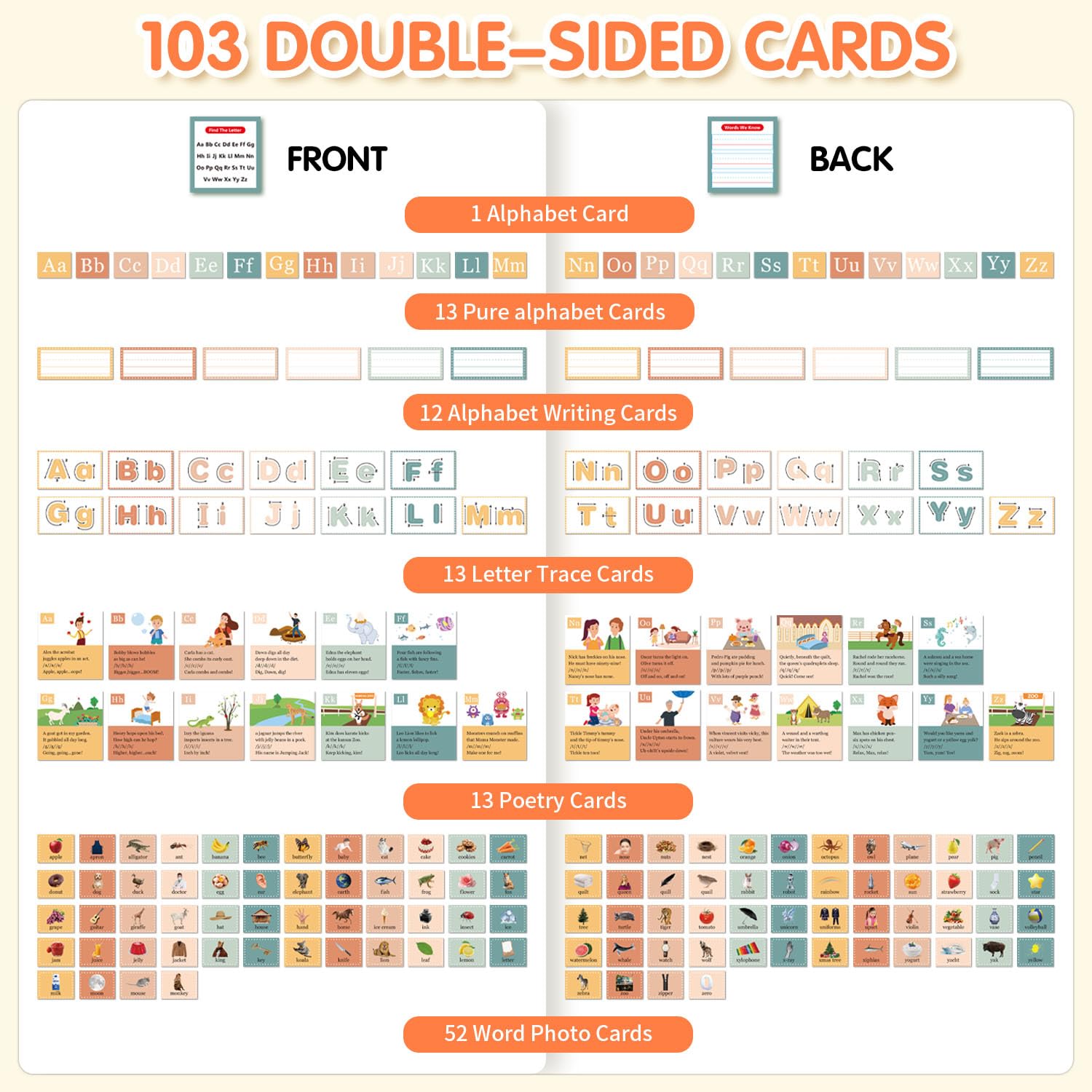 - 【VARIOUS CARDS】- The chart comes with tons of learning materials cards that explore each letter from every angle—including fun-filled chants that help kids identify each letter, full-color photo cards that develop letter sound recognition. Great tool to have to display the letter of the week and for students to refer back to throughout the week! Every day the children will look forward and become excited about the letter of the day activities.