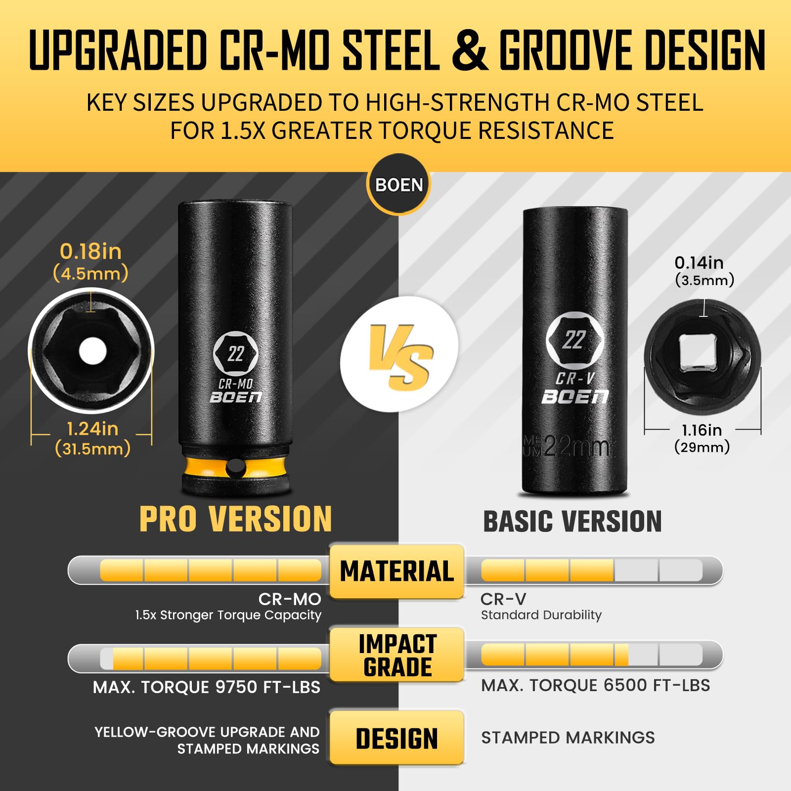 - KEY SIZES UPGRADED CR-MO STEEL: In response to BOEN users’ real-world experience. BOEN 1/2 inch METRIC impact socket set upgraded the most commonly used metric sizes (19mm, 20mm, 21mm, 22mm, 23mm, 24mm) to CR-MO steel to meet the high demands of professional use. These key sizes now offer 1.5x greater torque resistance and improved performance in high-torque applications, featuring yellow grooves for easy identification. The rest of the sizes are constructed with heat-treated forged CR-V steel, ensuring high hardness and durability for general use across a variety of tasks—Enhancing performance to deliver premium quality for BOEN users.