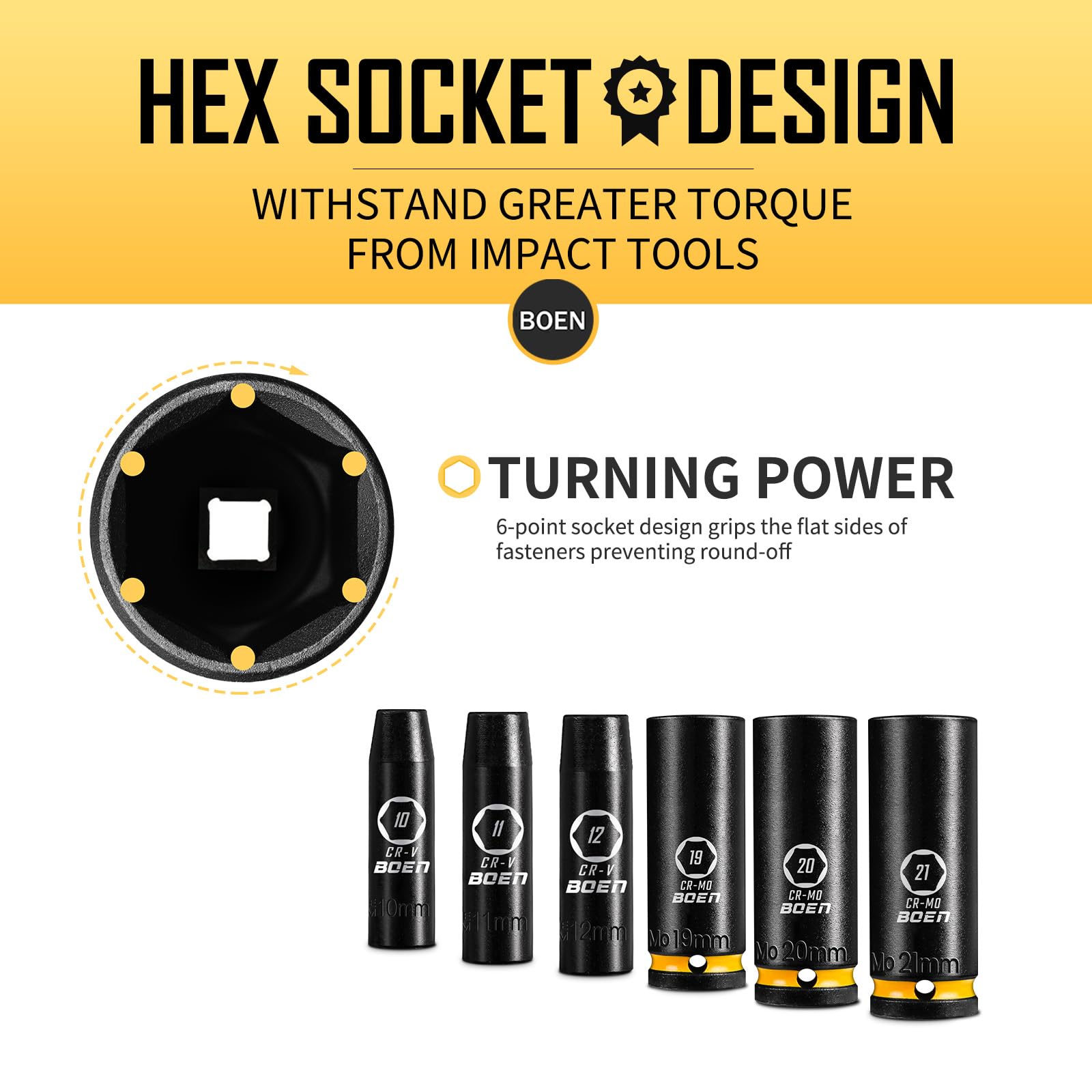 - FASTENED 6-POINT HEX DESIGN: The recessed hexagonal nut is easier to embed, which can grasp the stubborn fasteners without falling off. The 6-point lateral drive design prevents the sockets from rounding under the high torque output, making them maintain integrity without deformation
