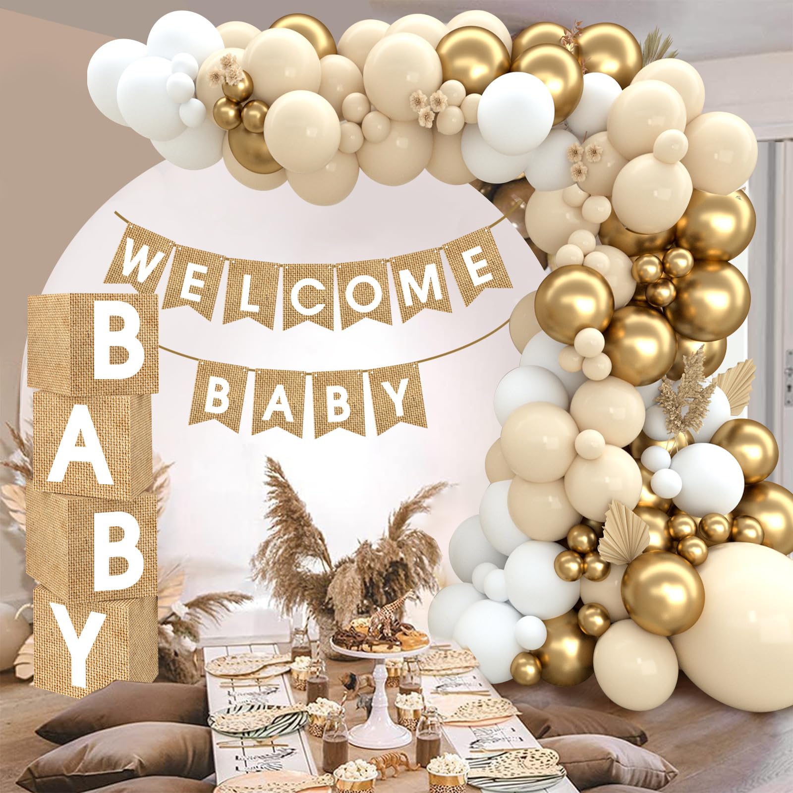Boho Baby Shower Decorations-97Pcs Burlap Grain Baby Boxes,Nude and Gold Balloons Arch Kit and "WELCOME BABY" Banner for Neutral Baby Shower Decorations,Birthday Party Supplies,Gender Reveal