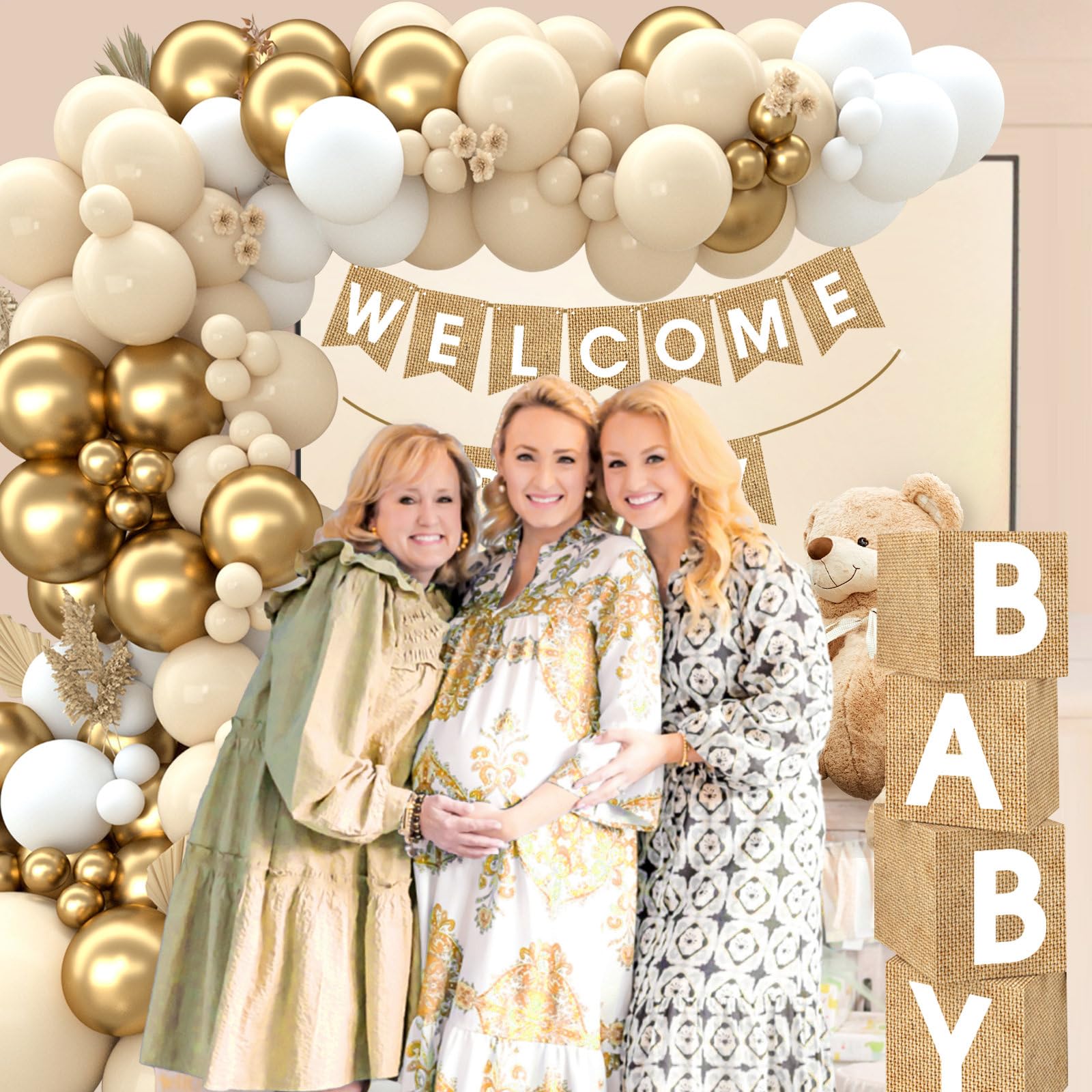 - Premium Material-Neutral baby shower boxes and "WELCOME BABY" banner are made of sturdy paper and other non-toxic materials.Our nude and gold balloons garland kit are made of high quality natural latex,safe and non-toxic,the leather is thick, not easy to burst,and the color is true.