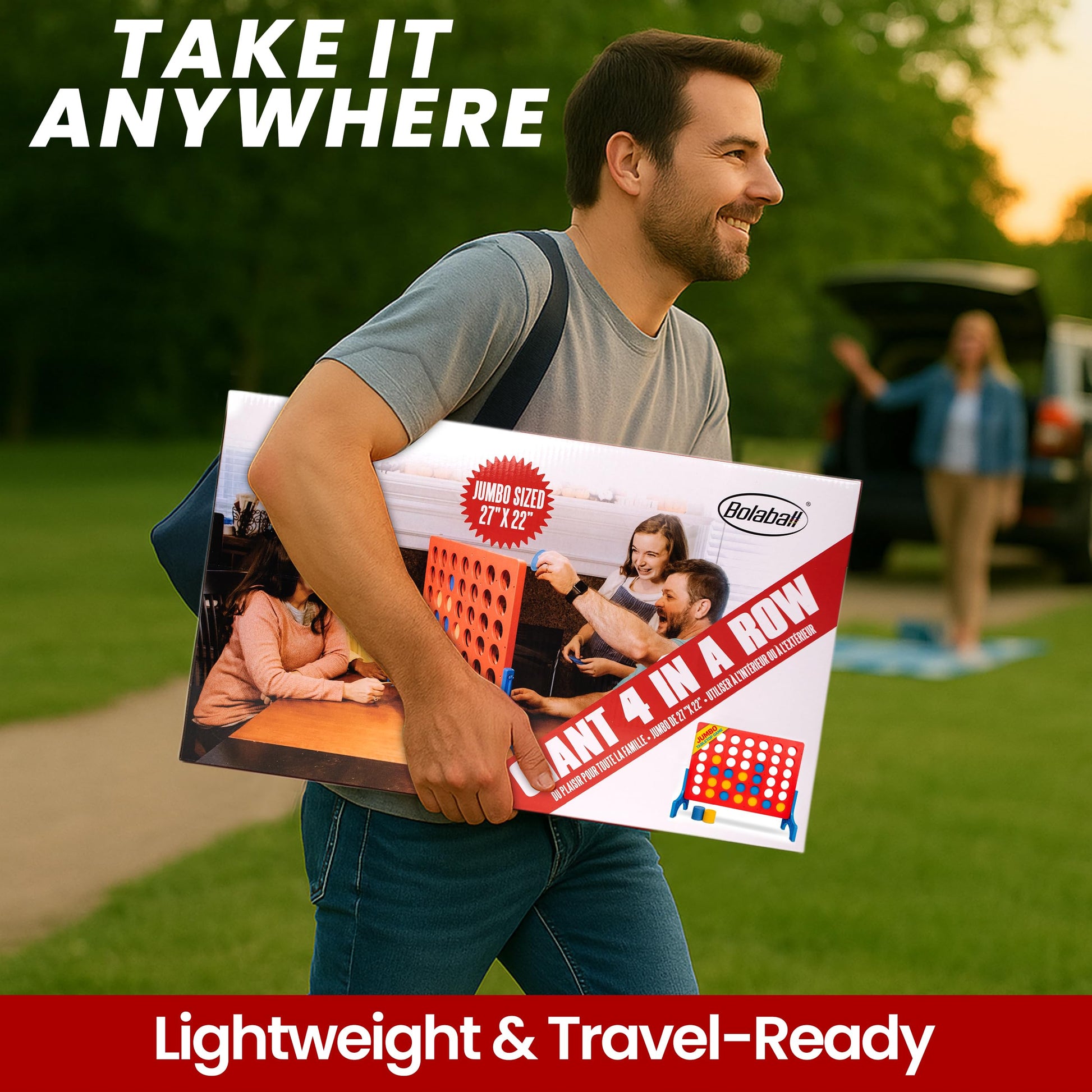 - EASY TO STORE AND TRANSPORT: The Bolaball Giant four connect in a row lawn game can be played anywhere. The legs come off and the whole game board collapses into three sections for easy transport and so that when you pull out your huge 4 connect in a row game, set up is a breeze! Take it to any family get together, lake party, beach party, tailgate party, birthday party, or any kind of get together! It can be played indoor, outside, or in your own back yard!