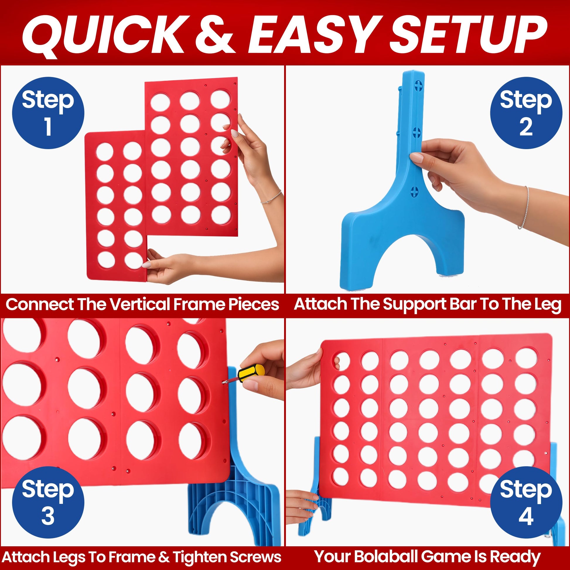 - EVERYTHING YOU NEED: Everything you need to revolutionize your family game night is right here. The Bolaball 4 in a row set comes with one collapsible, high-quality plastic gameboard, detachable legs, 42 plastic coins (blue and yellow), and an instructions pamphlet.