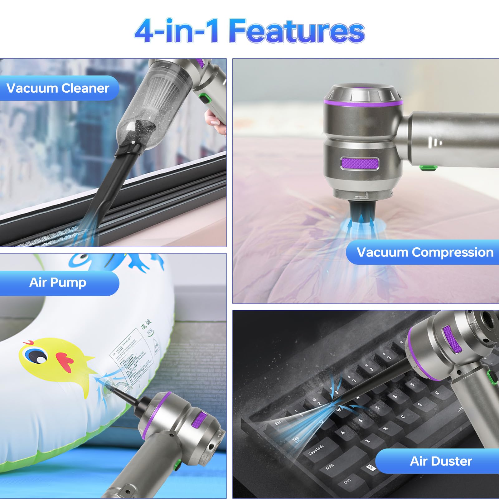 - 4-IN-1 MULTI-FUNCTION VACUUM CLEANERS - Our cordless vacuum cleaner equipped with four functions: suction, blowing, inflation and vacuum compression. Strong suction power to thoroughly clean every inch of space. owing design easily removes dust. The handheld vacuum's pumping power can be used to compress the bag, helping to save storage space. The inflatable function can quickly inflate inflatable items such as swimming rings, providing convenience for family entertainment or outdoor activities.