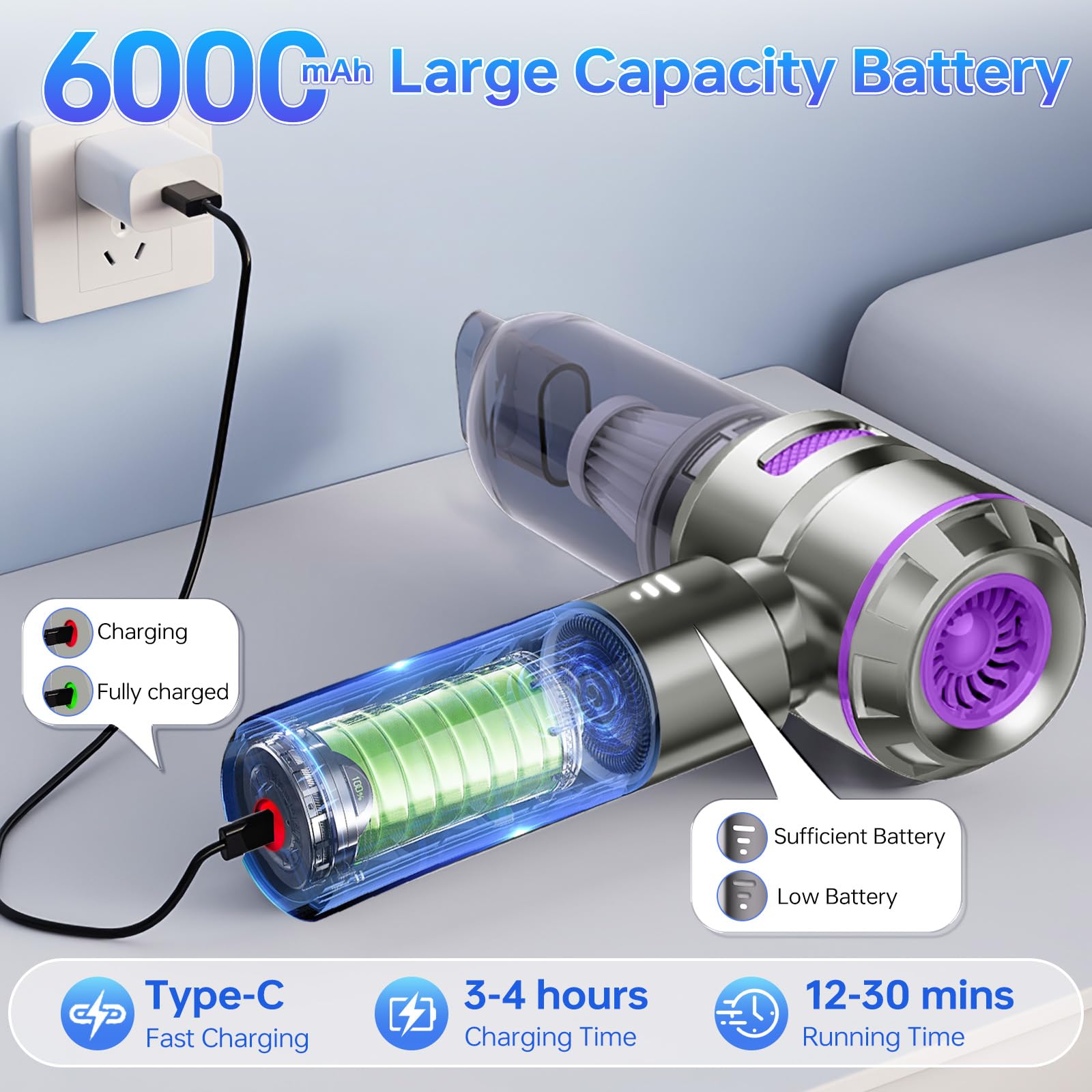 - LONG-LASTING BATTERY LIFE - This portable mini vacuum cleaner built-in 6000mAh high-capacity batteries provide you with strong power support, making cleaning easier and more efficient. With Type-C fast charging technology, it only takes 3-4 hours to complete charging (red light for charging, green light for fully charged) and can run continuously for 12-30 minutes after fully charged. The battery indicator light can remind you to charge on time when the battery is low (Please fully charge the device before first use).