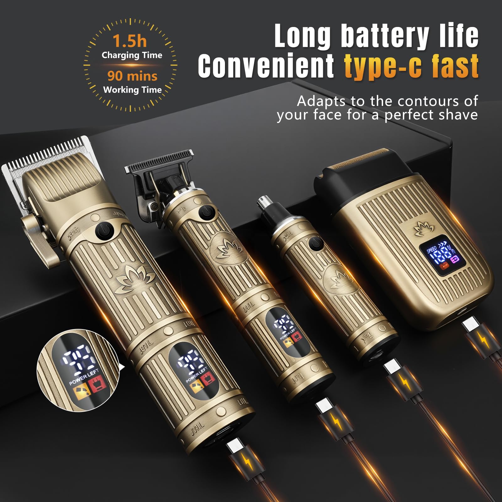 - USB Rechargeable Long Battery Life: This clippers for men barber kit Can be charged via USB; Equipped with a one - key switch; LED lights display the remaining power and charging status; Reminds users to recharge in a timely manner; The hair trimmer requires 1.5 hours of charging for 90 minutes of use; The trimmer needs 1.5 hours of charging for 90 minutes of trimming; The nose hair trimmer charges for 1 hour for 150 minutes of use; The Foil shaver charges for 1 hour for 120 minutes of trimming; Ensures proper usage speed and awareness of recharging time