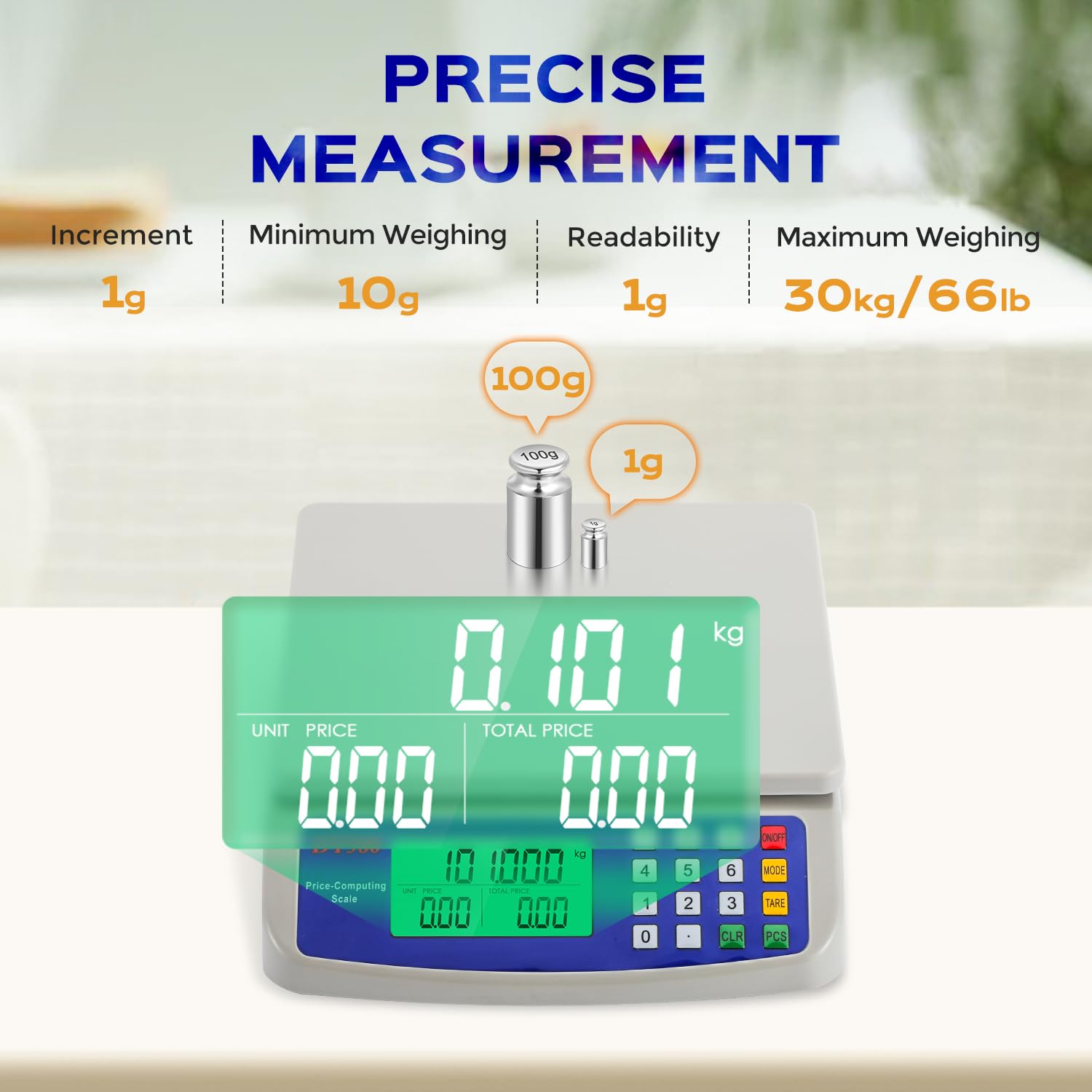 - Precise Weighing, Accurate Calculation - Bonvoisin price computing scale can weigh up to 66lb with 1g division. Just enter the price per kg or lb or oz, and it will automatically give you the price and weight per item, perfect for small business, produce market, grocery stores or home-businesses.