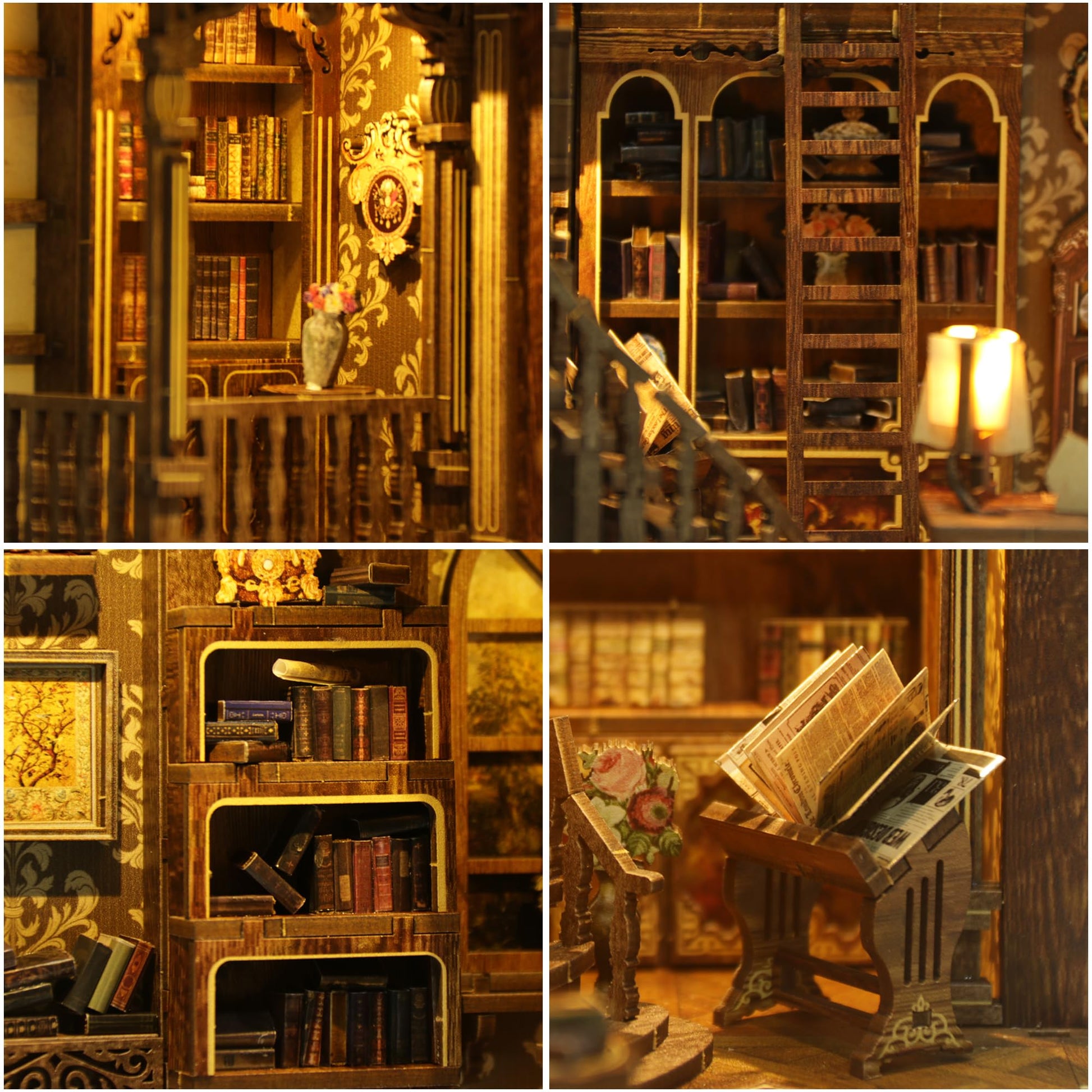 - VINTAGE BOOK NOOK DESIGN - This wooden book nook with its delicately carved frame evokes a nostalgic bookstore scene. Tall miniature shelves (detailed spines), a rustic ladder, and LED-lit lower niches (scrolls, tables) create a sense of depth. A dark wood finish and antique details like carved railings combine miniature craftsmanship with vintage charm—transforming any bookshelf into a literary sanctuary.