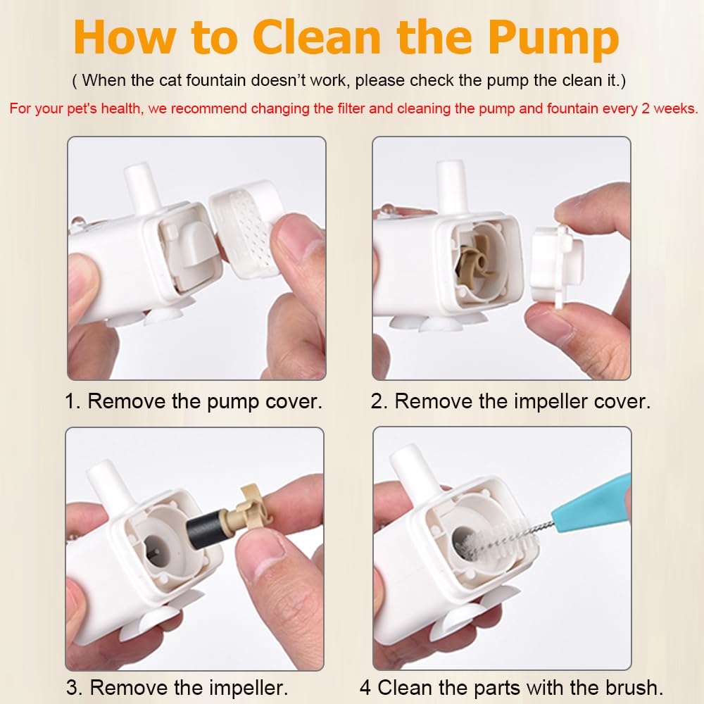 - 【Easy to Disassemble & Clean】The cat drinking fountains can be assembled and disassembled in just a few minutes, making it easy to clean and replace, do not use the dishwasher. For your pet's health, we recommend changing the filter and cleaning the pump and fountain every 2 weeks