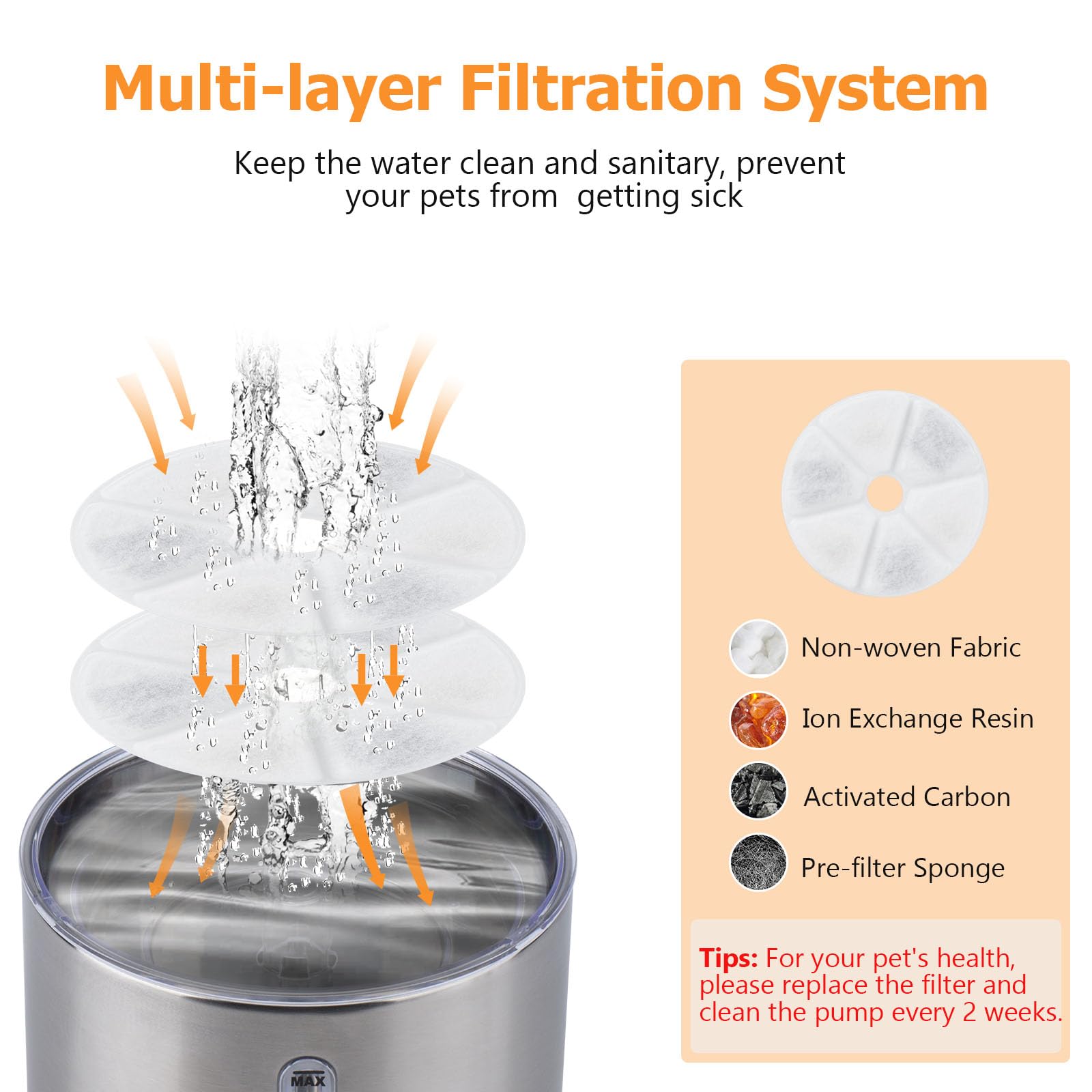 - 【Multi-layer Filtration System】 This dog water fountain has multiple filtration, including an activated carbon filter (consisting of high-density cotton, ion resin layer and activated carbon layer) and a filter sponge. The multi-filtration system filters hair, food particles, microorganisms and odors from the water