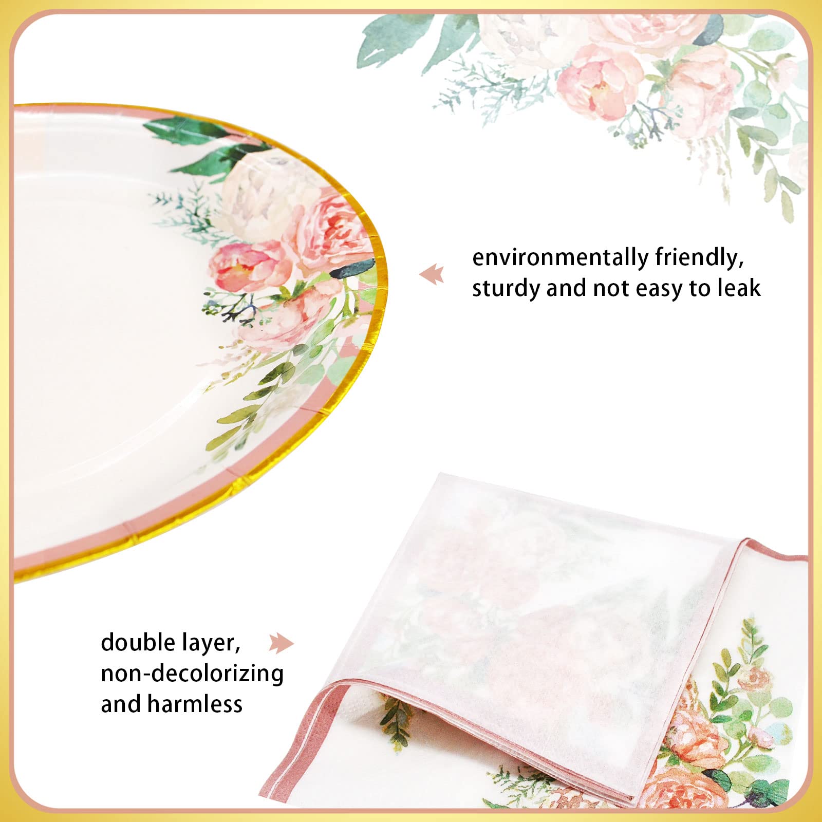 - ✿【Floral Party Pack for 50 Guest】The floral spring party decorations set include 50 9"dinner plates, 50 7"dessert plates, 50 Napkins.You can serve 50 persons at the same time. Do not microwave the plates, paper cups are for cold drinks only.