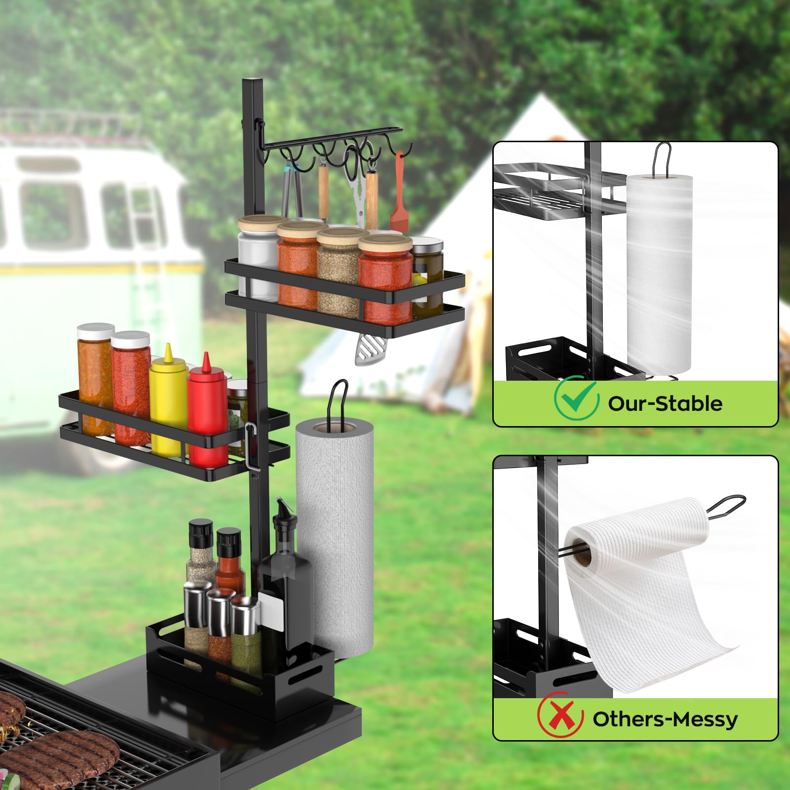 - 【Windproof Paper Towel Holder】This is a perfect outdoor kitchen accessories. Outdoor barbecue often encounters paper towels being blown away by strong winds. To solve this problem, the blackstone grill accessories feature a vertical paper towel holder, no need to worry about the paper towel being loosened by the wind and you can enjoy your BBQ party with confidence!