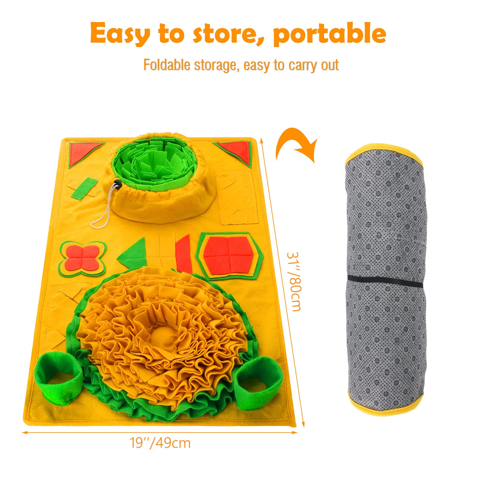 - 🐶Anti-slip & Portable Design - The size of snuffle mat for dogs is 31.5"x 19.3"(80x49cm),which is great for small,medium and large dogs,cats and rabbits .Anti-slip design at the bottom effectively holds the mat and prevents your dog from tipping over and moving the mat.The snuffle mat is easy to fold and can be placed in a storage bag ,which means it is easy to carry and suitable for travel