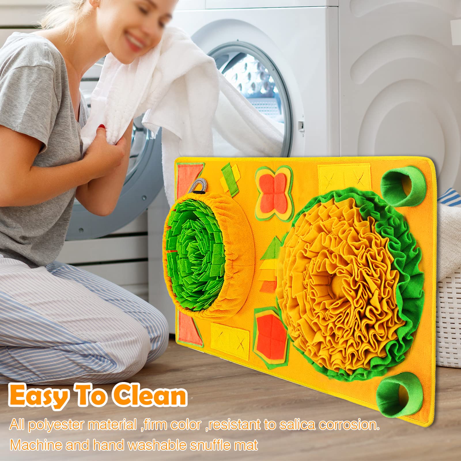 - 🐶High Quality Snuffle Mat- The dog activity mat is made of high-quality fabric,sturdy,safe,non-toxic and pet-friendly to make your dog feel comfortable.This dog puzzle mat is very easy to clean and you never worry about the health of your dogs! It is machine washable but we suggest hand washing