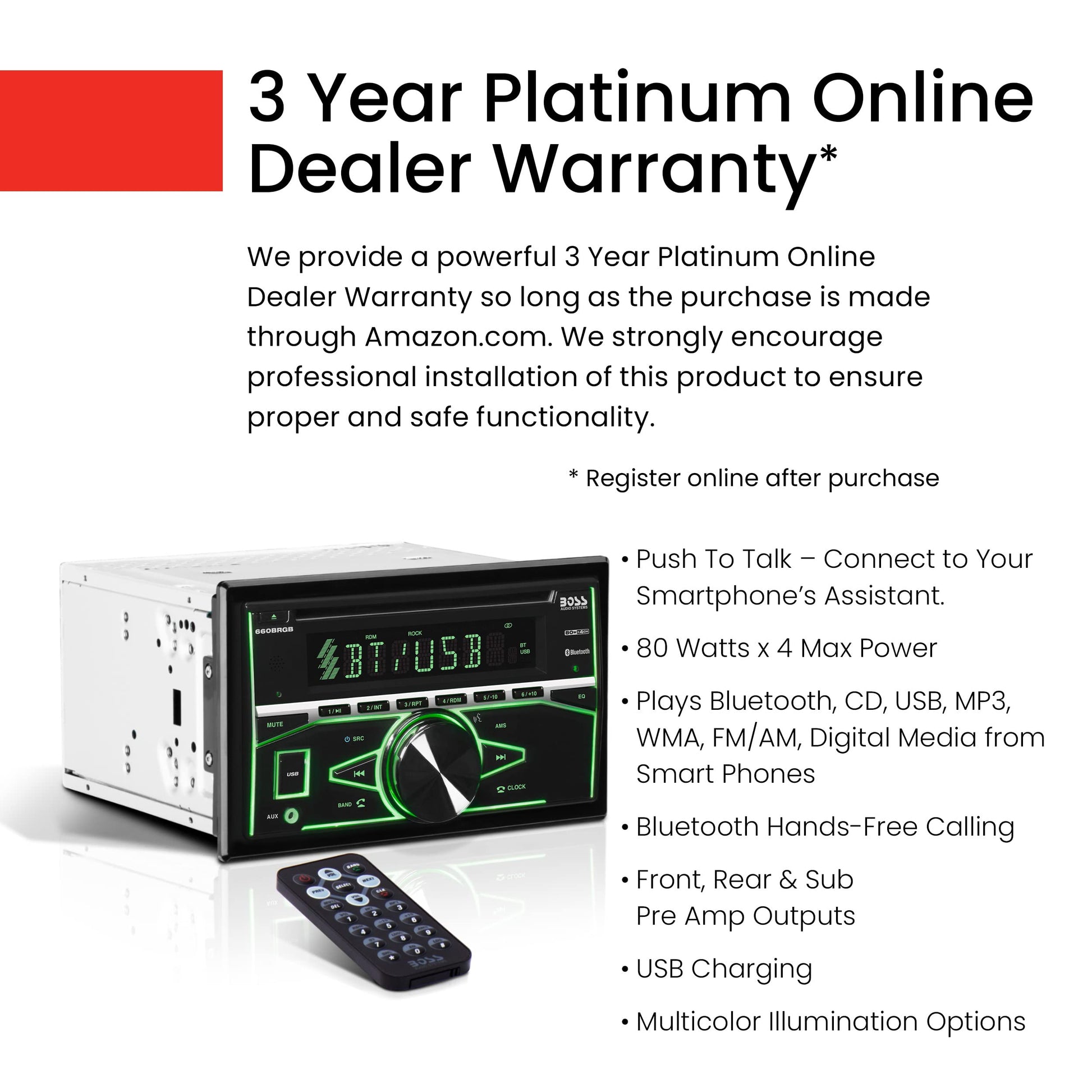 - WARRANTY: BOSS Audio Systems Provides A Powerful 3 Year Platinum Online Dealer Warranty So Long As The Purchase Is Made Through Amazon Dot Com.