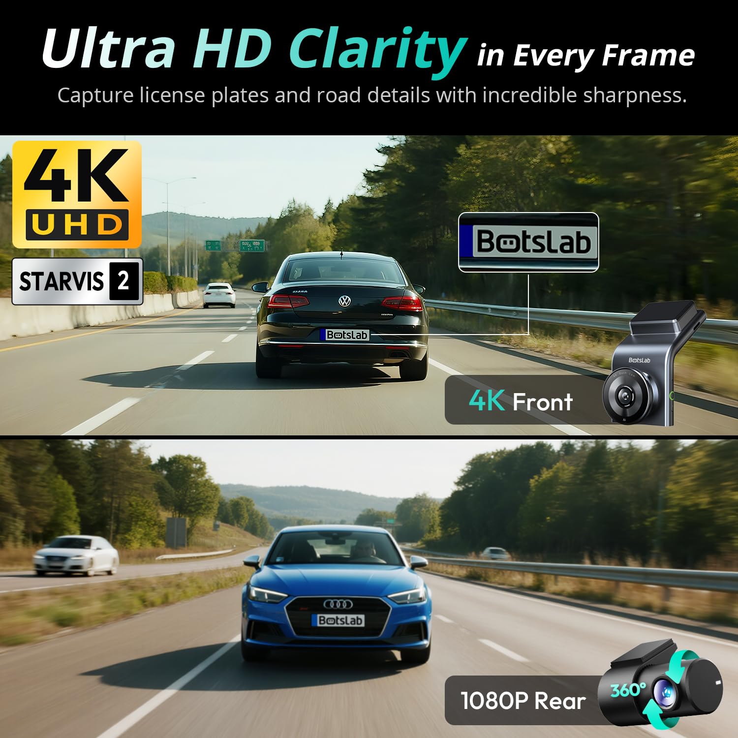 BOTSLAB 4K Dual Dash Cam Front and Rear, STARVIS 2 Sensor, Voice Command, 64GB Card Included, 5GHz WiFi Dash Camera for Cars, Built in GPS, WDR Night Vision, 24H Parking Mode