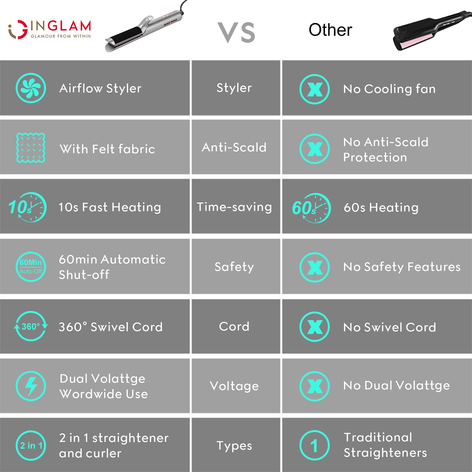- Great Gift Choice: The INGLAM 2 in 1 professional hair iron had what you want Accessories required. The requirements include gloves, shelf, comb, and bag. These accessories required will take in an exquisite gift box. It is a wonderful present gift when you give a gift. We offer you a 12-month warranty and 24-hour friendly email customer service and Lifetime Technical Support. You can use it with confidence! If you have any questions, please contact us in time. Thanks!