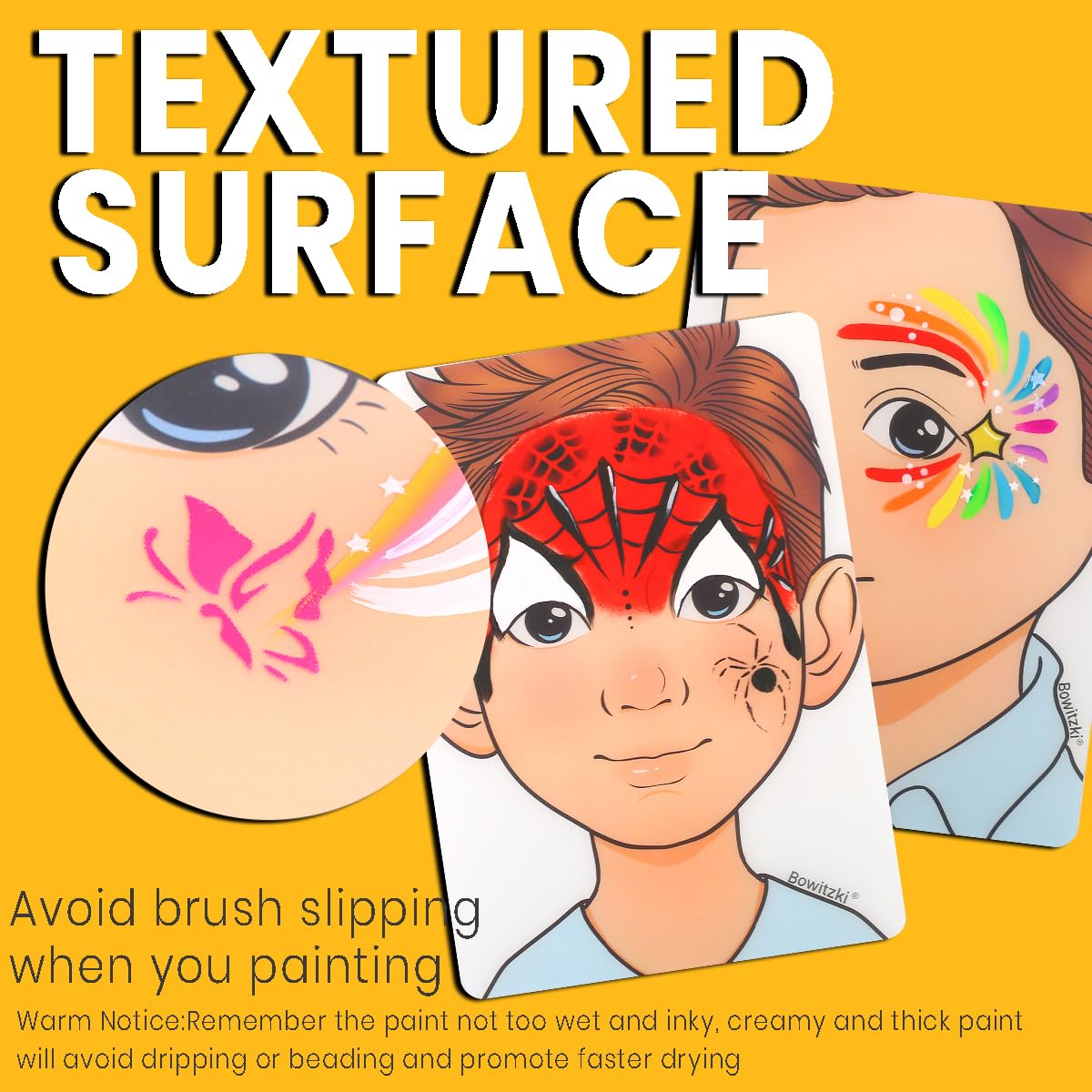 - Essential tool for face painters: Bowitzki Face Painting Practice Boards are great tool for face painters to practice and improve their skills. Perfect for beginners, experienced artists to try out their designs,such as face designs, eye designs, cheek designs.