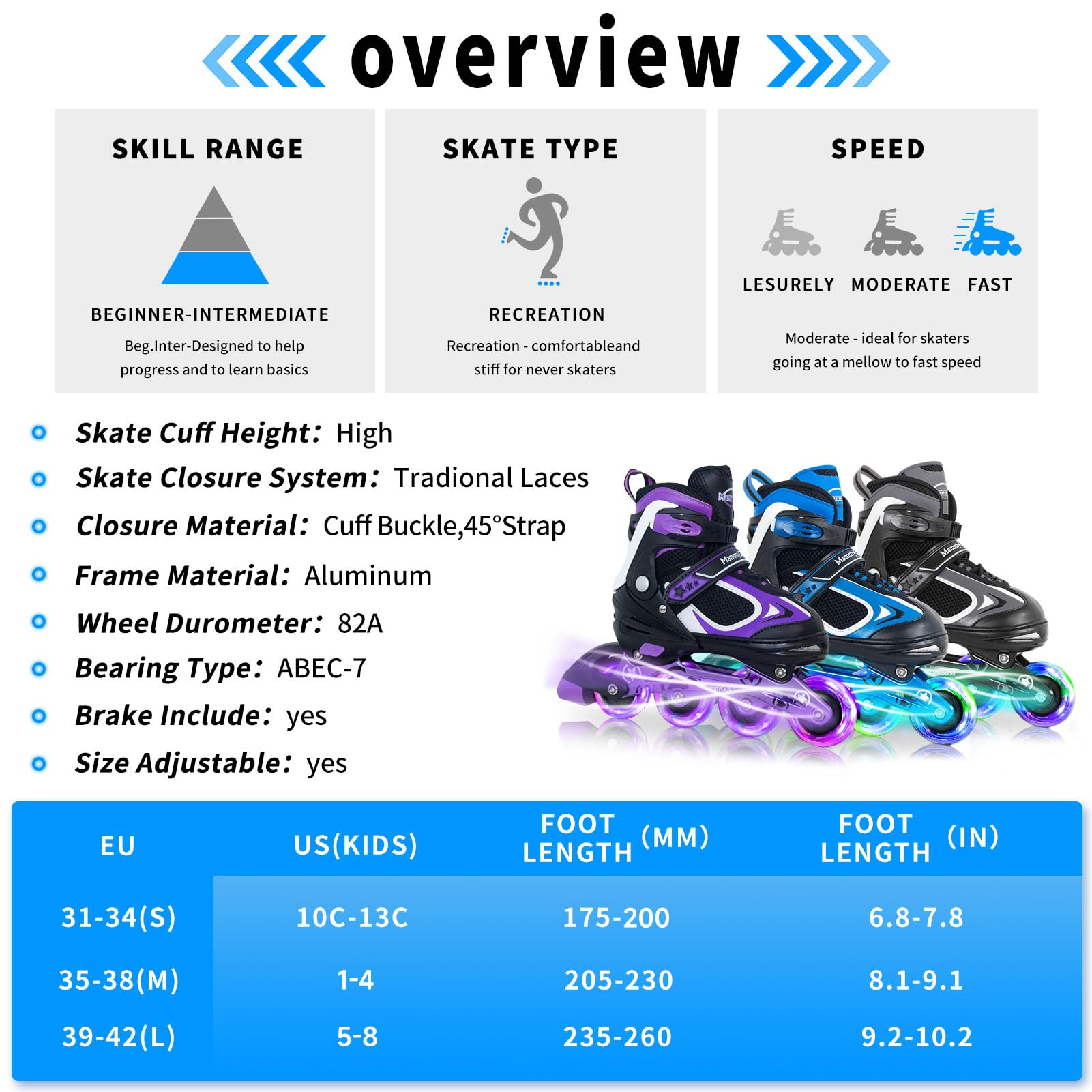 - FOUR SIZES ADJUSTABLE: MammyGol inline skates have 4 different Unisex size , S(10-13US)/M(1-4US)/L(5-8US), and each size is adjustable, only need 1 push button to adjust different sizes. Please make sure to choose the correct size via checking size chart pictures. Let our inline blades skates grow with your child