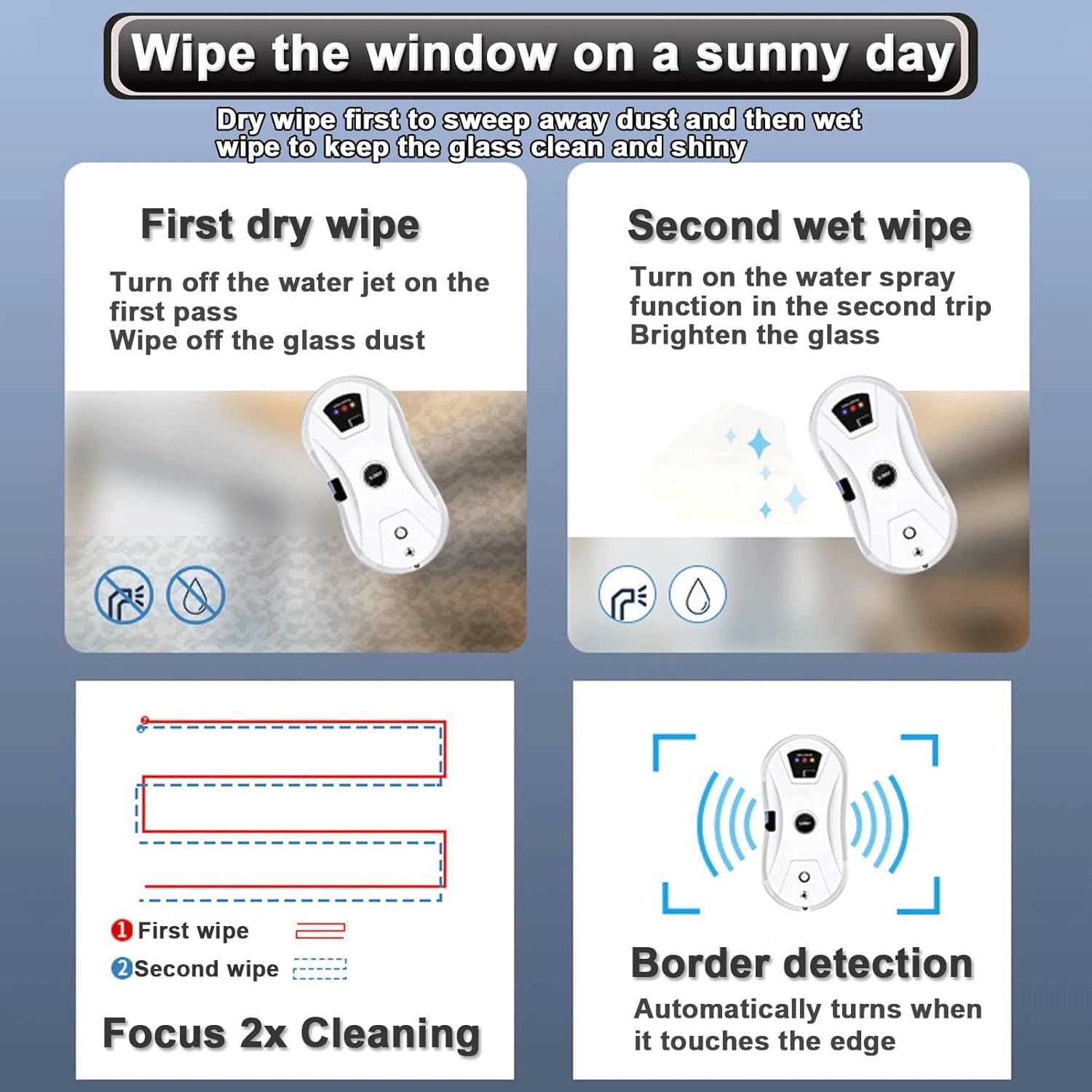- 【Super Suction】 Automatic window cleaner robot is equipped with a brushless motor, which increases the service life and reduces noise. 5600Pa super powerful suction power makes the robotic window cleaner stronger adsorption power and easier to remove stubborn stains. Optimized cleaning process, cleaning faster, saving more time, perhaps the best window cleaning robot experience you have ever had.