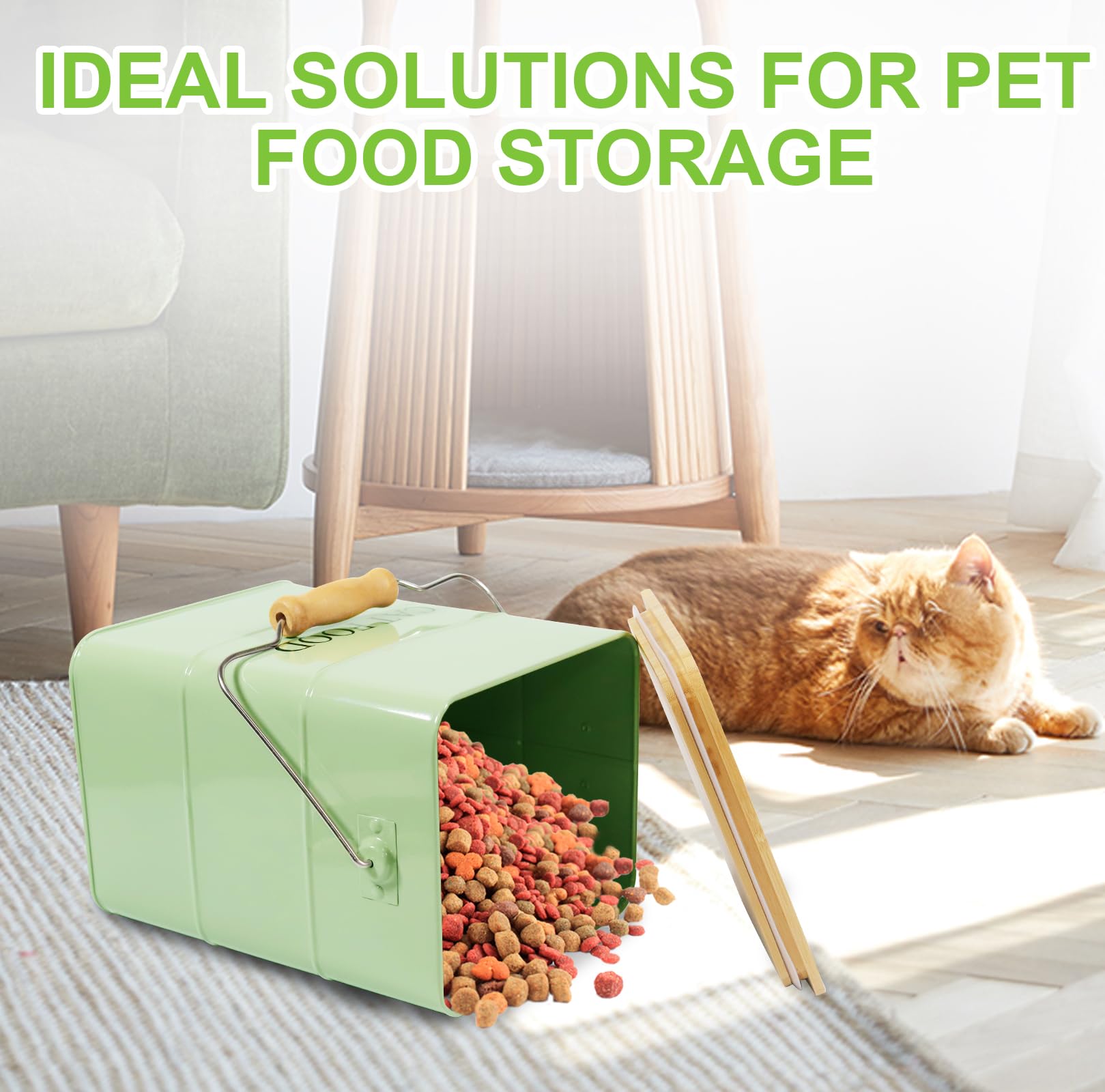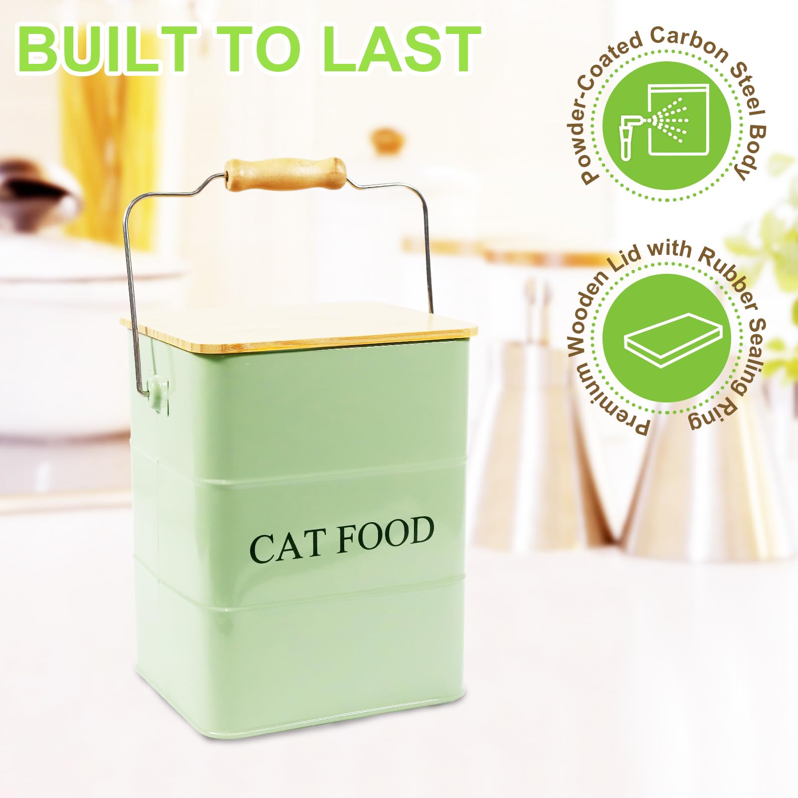 Brabtod Cat Food storage container Cat Treats Jar, Metal food treats tin for Cat, pet snacks Canisters with wooden lid/handle/sevice scoop,hold 5-6 lbs-Green