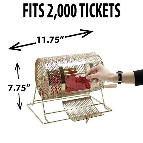 Details: Ensure your raffle is legitimate with our raffle ticket drum. The durable perforated brass drum allows you to see the tickets inside and helps build anticipation. The sturdy construction will ensure years of enjoyment! The small raffle drum will hold approximately 2,500 tickets. Drum Diameter 8 Inches. Drum Width 15 inches. Stands 11 inches tall with base.