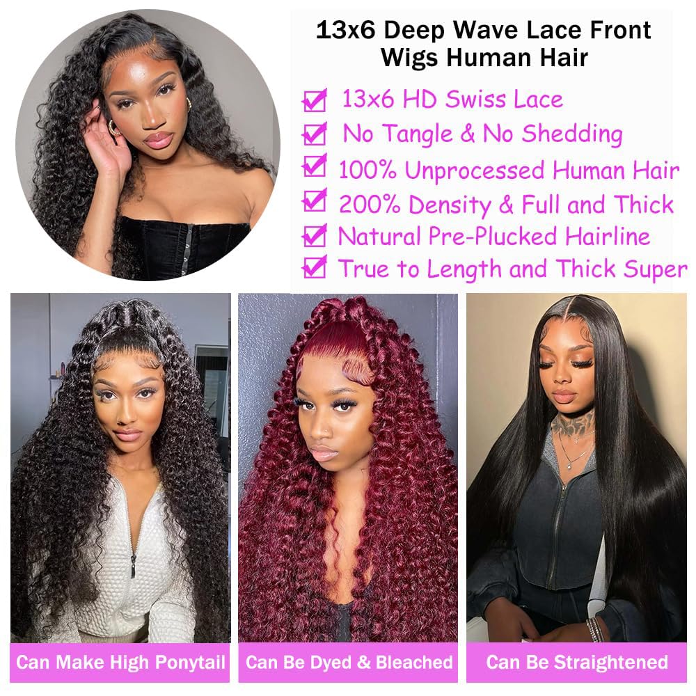 - 【Hair Material】: 100% unprocessed brazilian virgin deep wave human hair lace front wigs for black women, natural and healthy, soft and silky, breathable and comfortable. glueless wigs human hair pre plucked with natural hairline, baby hair around more natural looking.