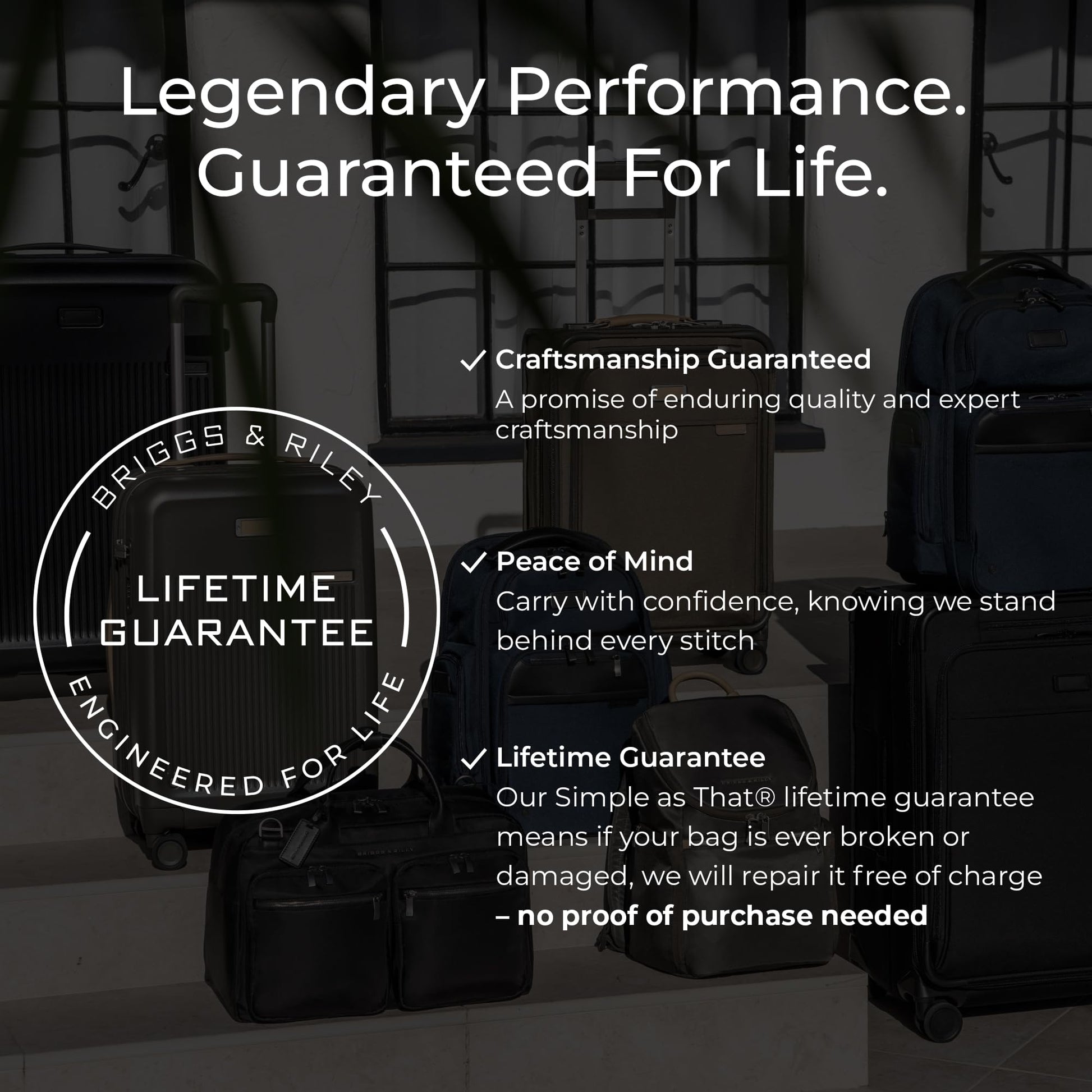 The Briggs & Riley travel toiletry bag (5.3" x 10" x 4.5") stores everything from makeup, shaving essentials, to even small electronic accessories. With a generously sized main compartment and a back pocket to maximize room for all your travel essentials. It also comes with a side grab handle for easy carrying while on the go. Toiletry bag can be cleaned with a soft, damp cloth or an adhesive lint brush roller. If your bag is ever broken or damaged, we'll repair it free of charge, no proof of purchase needed, no questions asked.