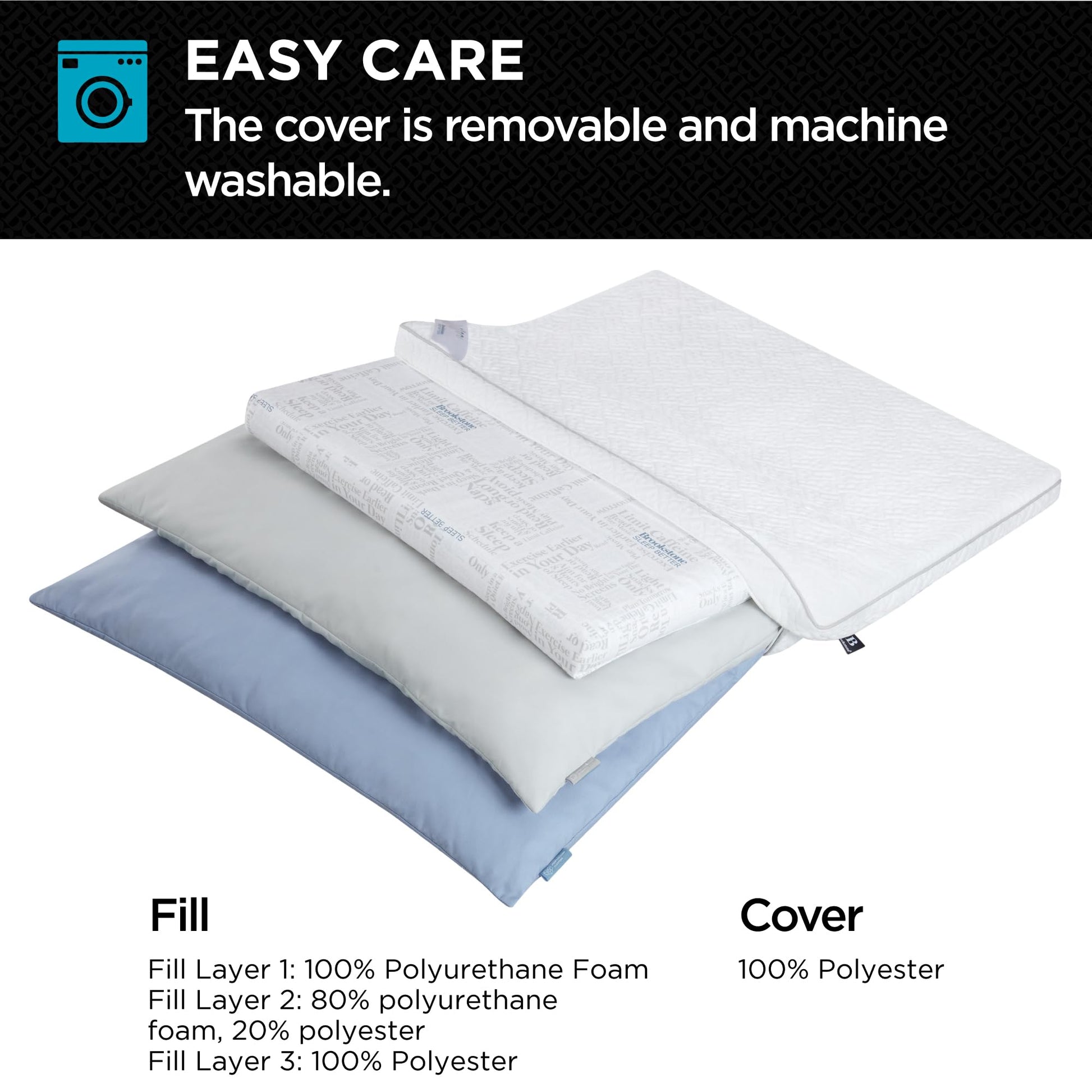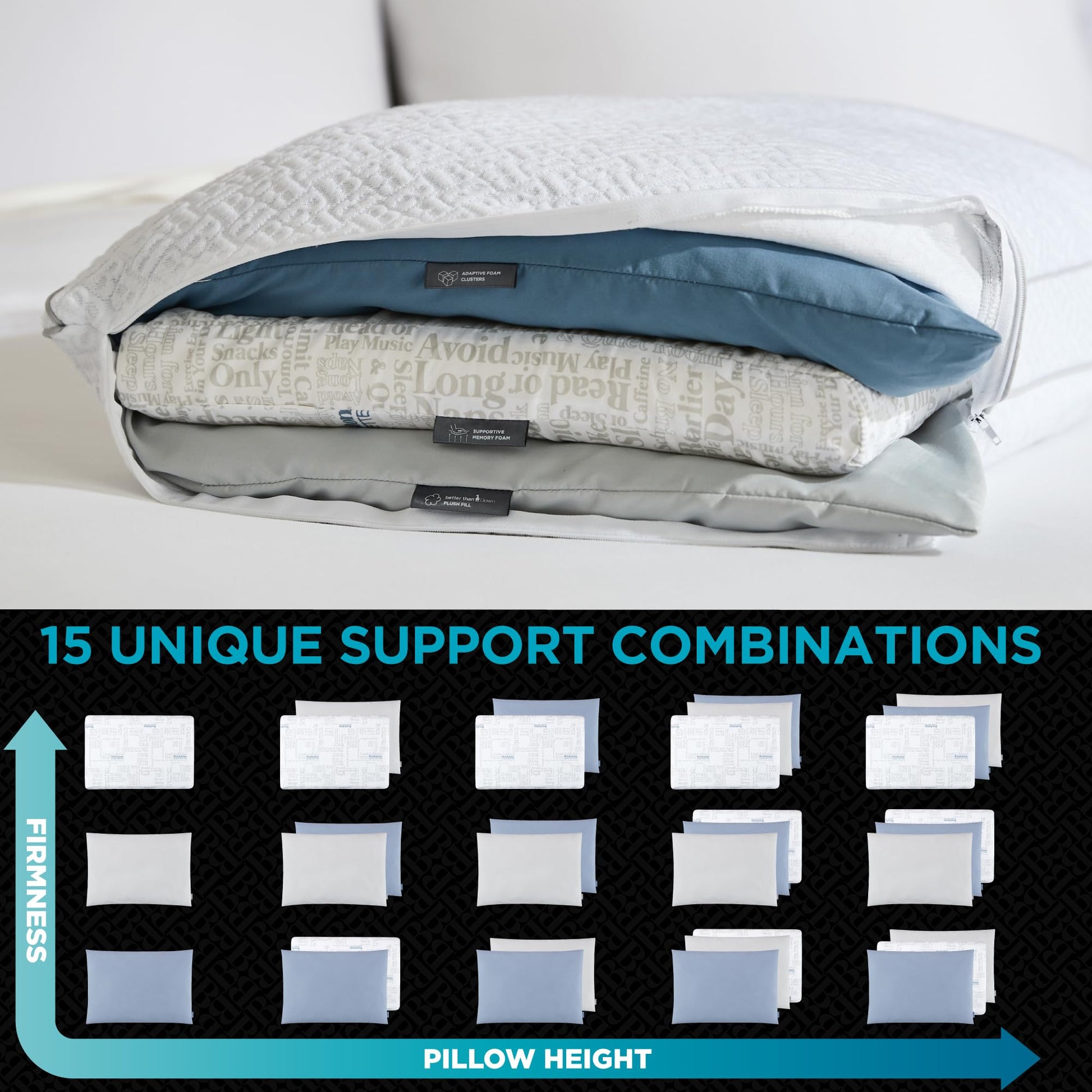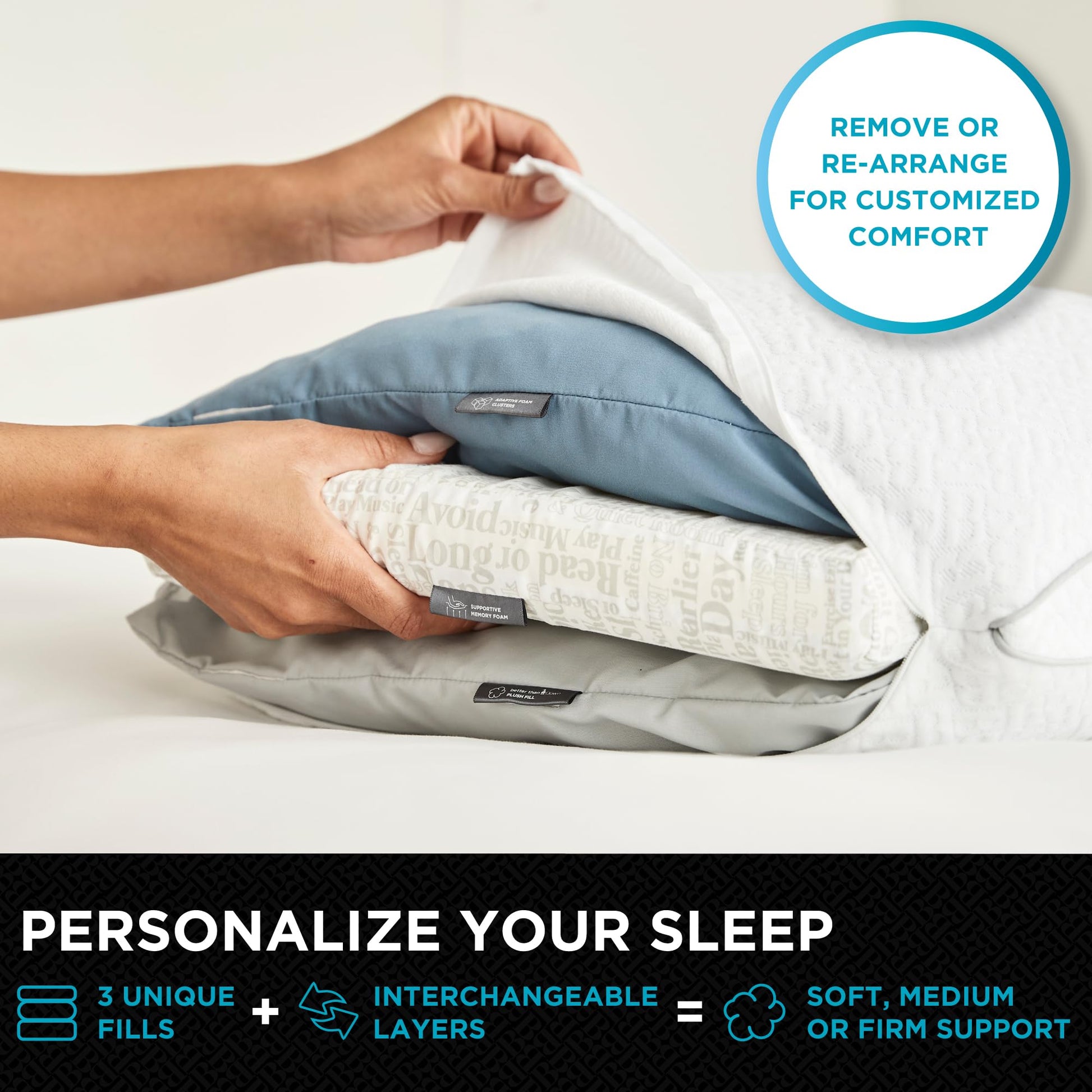 - Customizable Comfort: Discover your ideal sleep setup with the Brookstone Layer Adjust Utility Pillow. Featuring three unique fills - memory foam, adaptive foam clusters, and Better than Down庐 hypoallergenic fill - this adjustable pillow offers an array of 15 different combinations. Enjoy the power to switch between firm, medium, or soft support to suit your comfort needs night after night