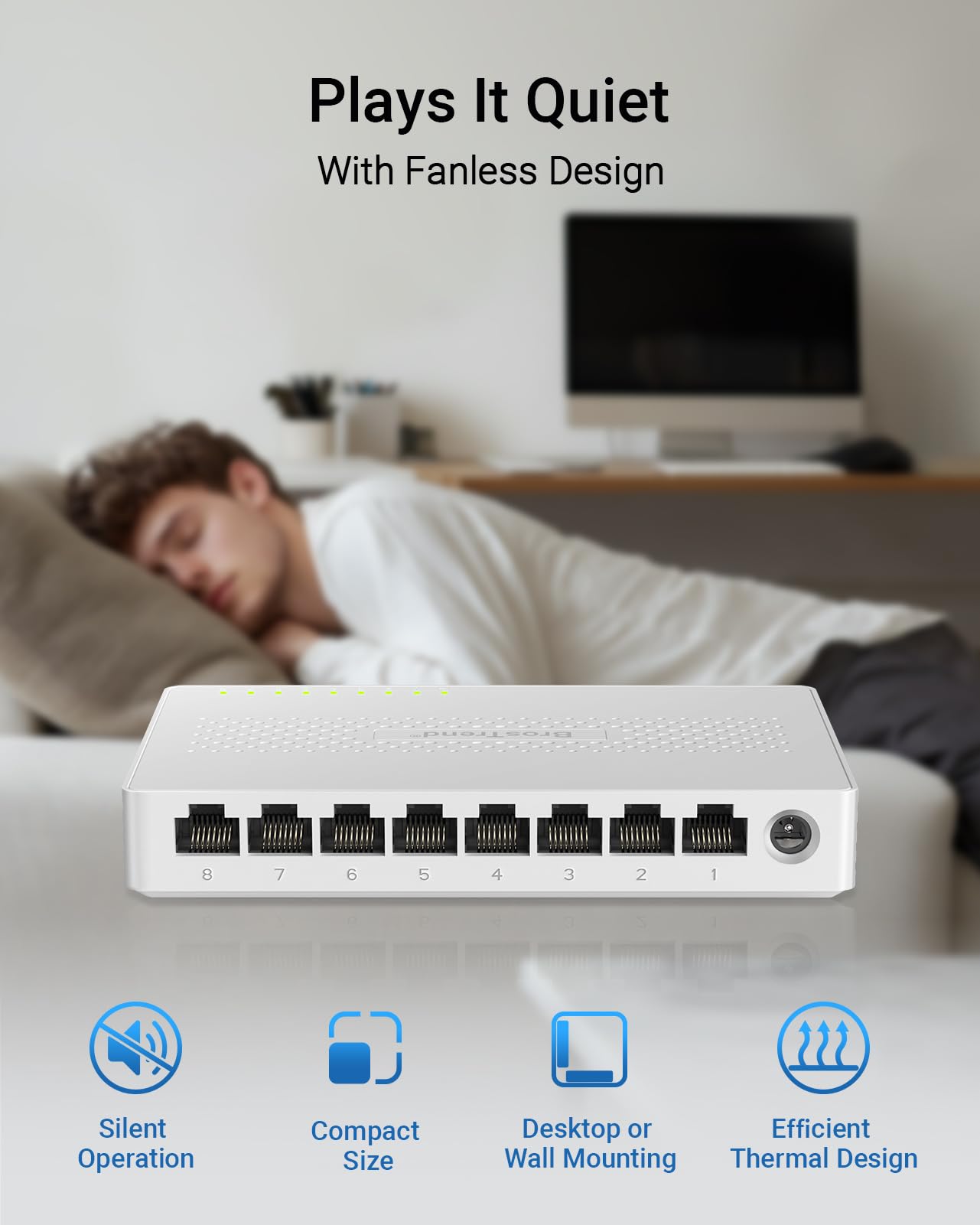 - Plays It Quiet: The fanless design of the Ethernet switch ensures silent operation, so it never interrupts your work or rest. It remains whisper-quiet even during demanding tasks