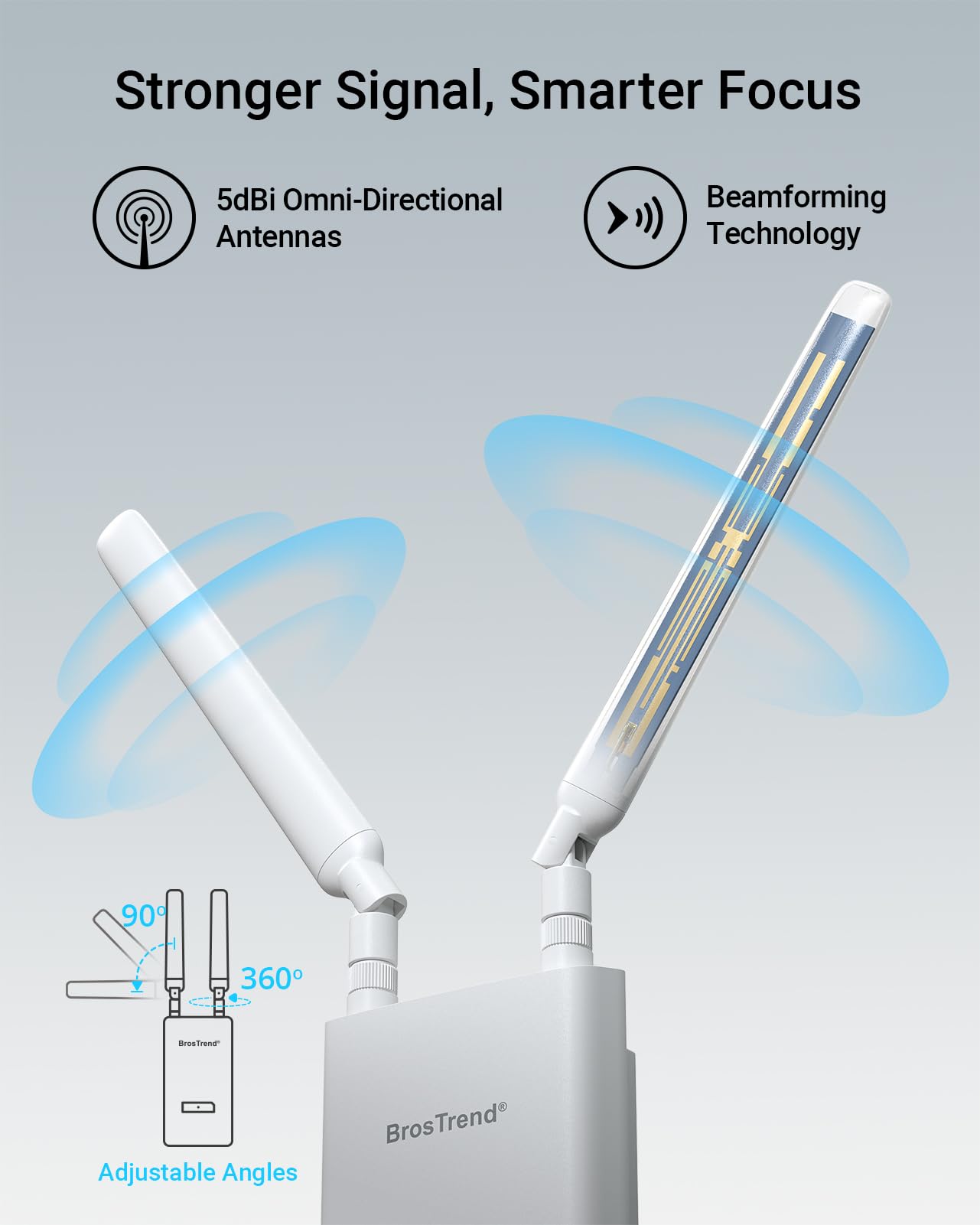 - Stronger Signal, Smarter Focus: Two adjustable 5 dBi omni-directional antennas combined with Beamforming technology extend coverage and direct more powerful, consistent signals from your outdoor WiFi AP to devices across outdoor spaces