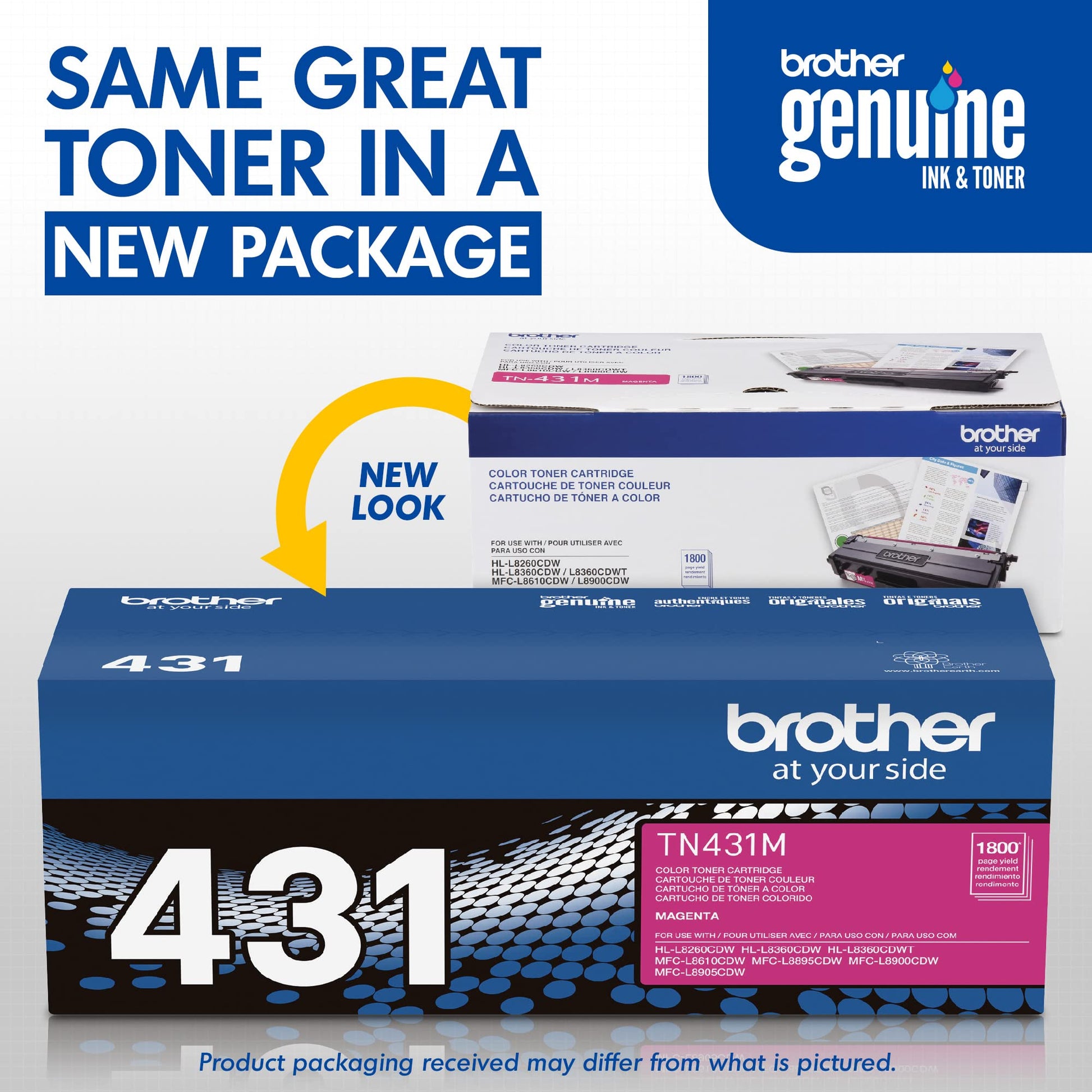 Brother original TN431M Standard Yield Magenta Toner Cartridge, original toner replacement cartridges, toner for Brother laser printers HL-L8360CDW, HL-L9310CDW, MFC-L8610CDW, MFC-L8900CDW, and more