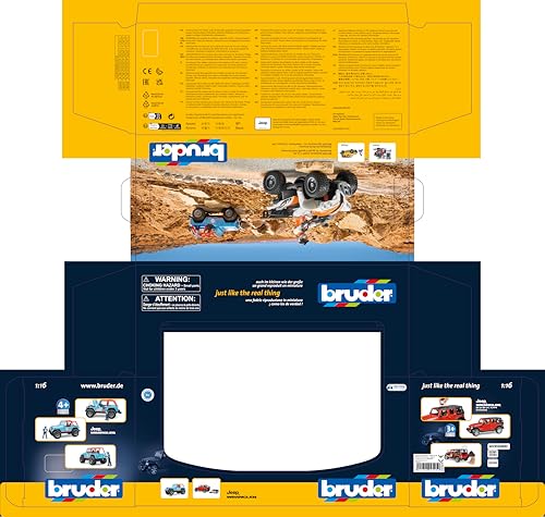 Details: In addition to the two-part, detachable segment roof, the bonnet, rear door and all four side doors open. It goes without saying that the vehicle provides enough space on the inside for four Bruder bworld figures. Alternatively, the rear seat can be removed to create space for accessories compatible with Bruder standard connectors. The additional drag link is intended to facilitate steering through the roof hatch and if it is not required, it can be stored in the vehicle underbody. The axles feature typical off-road vehicle suspension and tread tires with wheels in appealing SUV design. The front interface, suitable for items including the optionally available cable winch and the detachable drawbar coupling mean there are unlimited possibilities for enhancements in the world of Bruder.