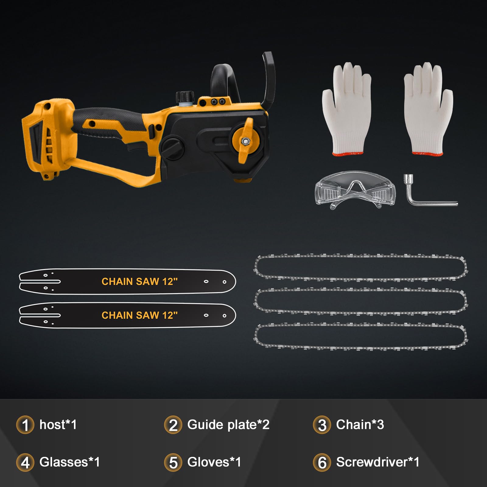 - Rich Accessories for Security Usage: Your safety is our top priority. The cordless chainsaw features with multiple designs to enhance security use. Firstly, the Security Lock prevents accidental activation. You must press the security lock and power switch at the same time to start. Then, the Anti-splas Baffle prevents chips from splattering on your body. Lastly, equipped with anti-cut gloves and goggles to keep your hands and eyes security.