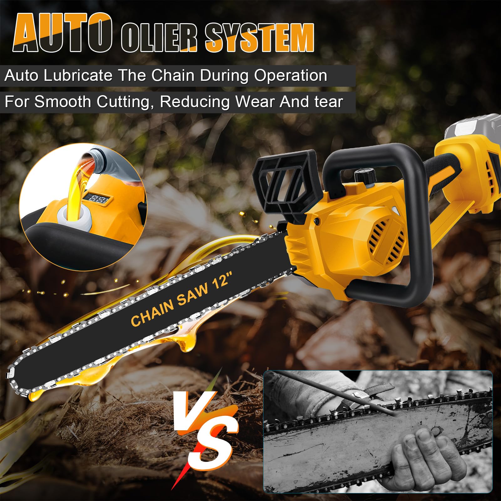 - Convenient Auto Olier System: This cordless chainsaw is featured with auto chain lubrication system. With this system, you no need to oiling the chain manually, the chainsaw will auto lubricate the chain during running, ensuring smooth cutting and reducing wear and tear.