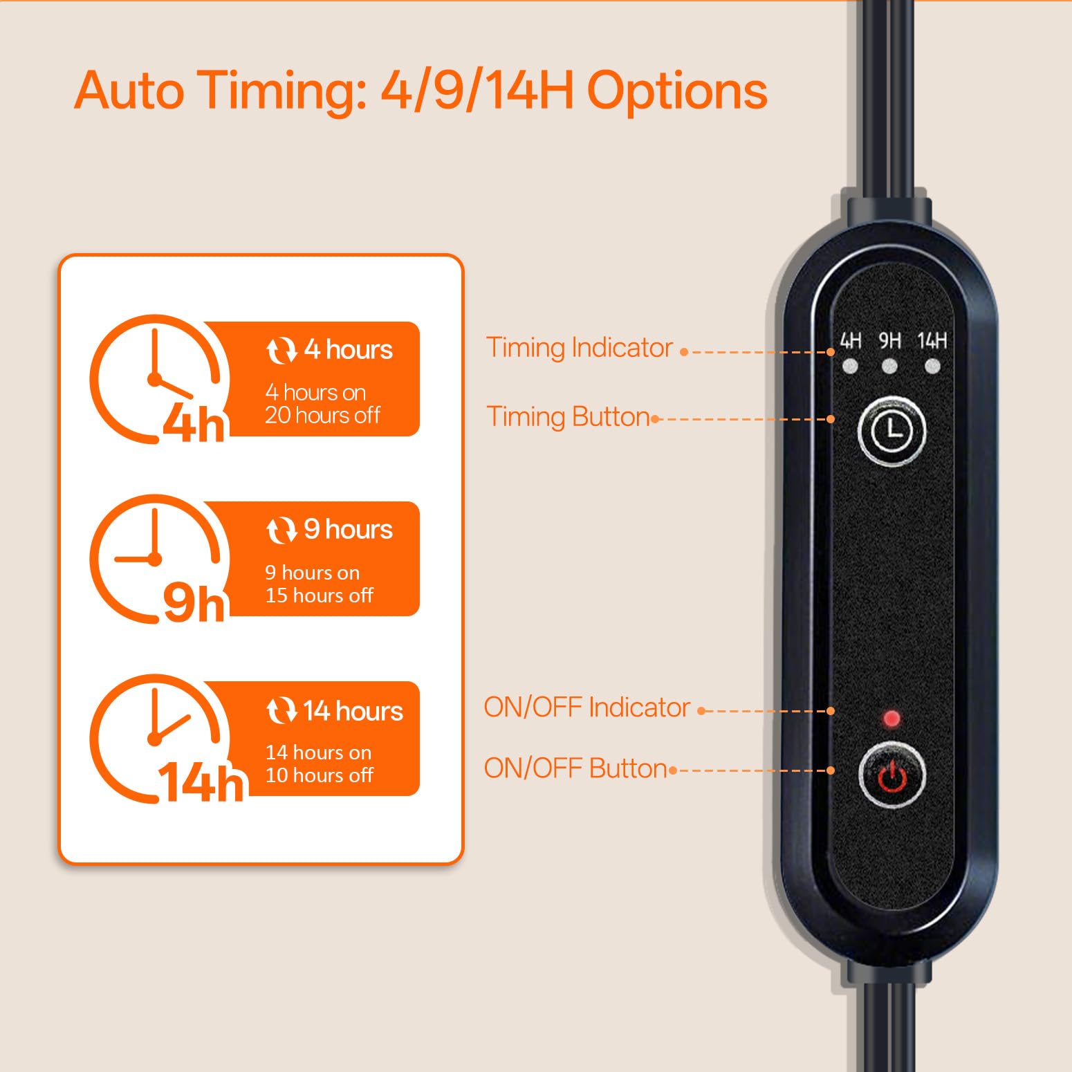 - Smart Auto On/Off Timer Function - Effortlessly schedule your plant care with 4/9/14-hour timer options. Perfect for busy botany hobbyists, this grow light with timer feature ensures your greens get consistent daily light without manual switching. Wake up to happier plants every day