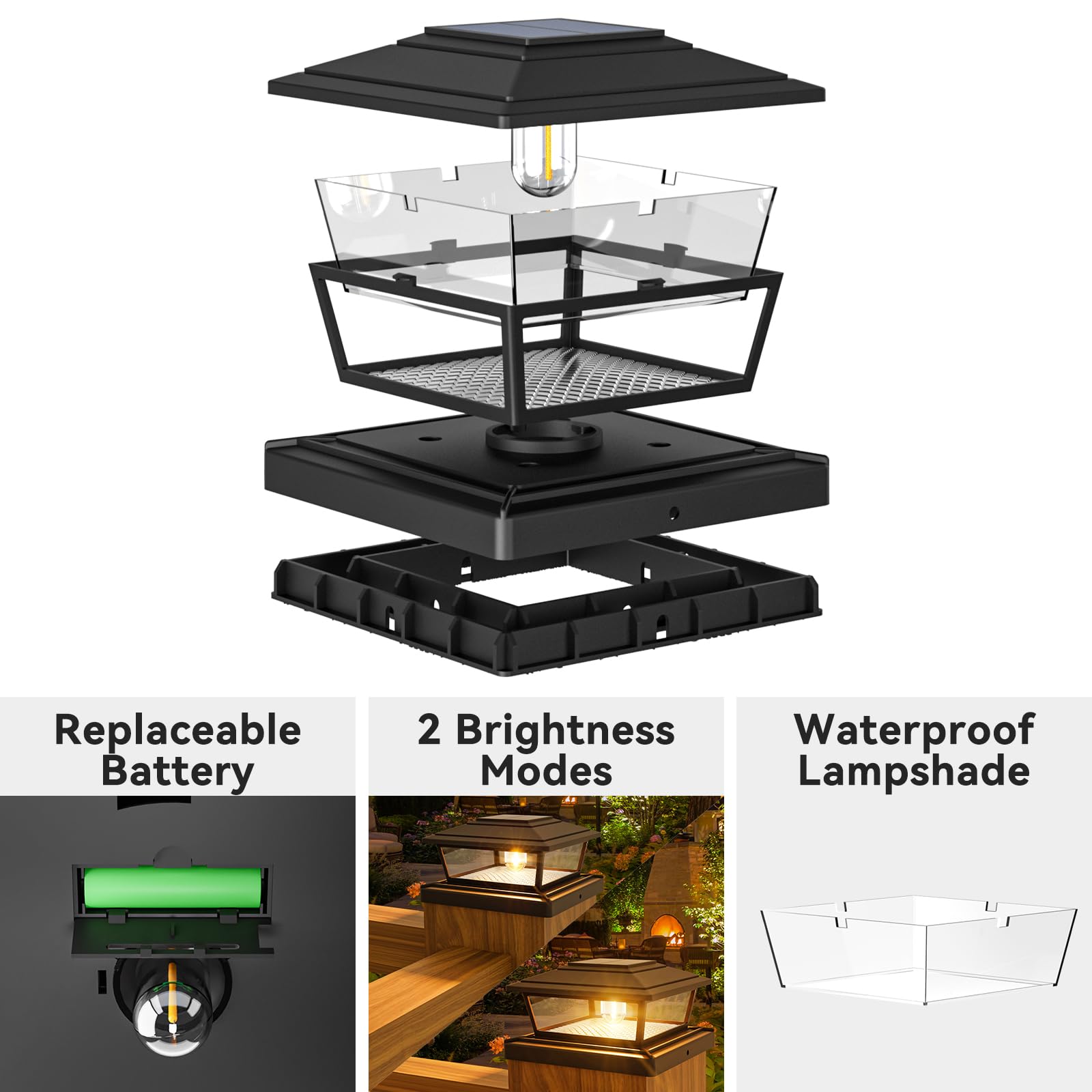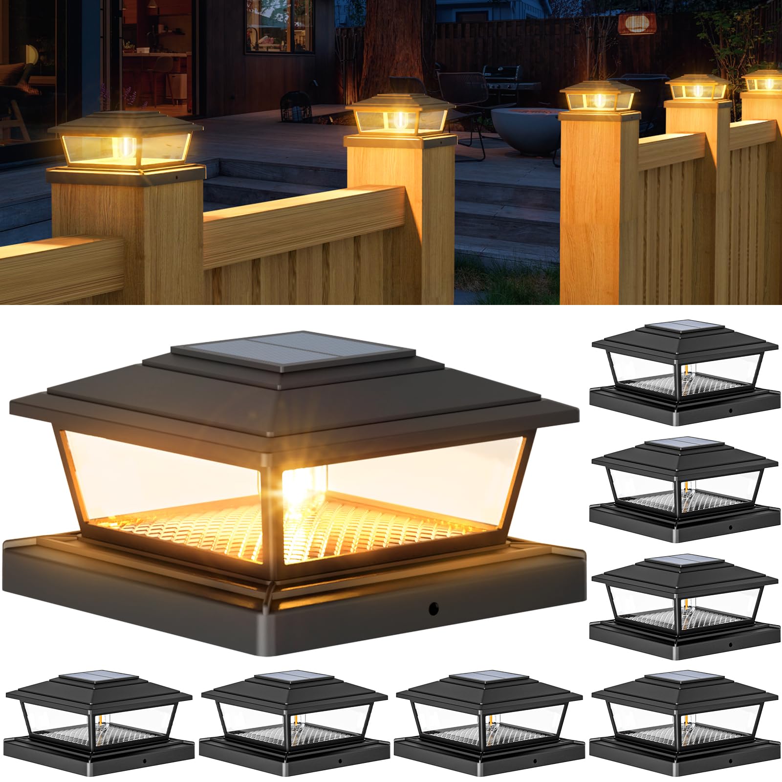- Solar Efficient Powered Supply: btfarm 6x6 solar post cap lights are powered by high efficiency solar photovoltaic panels and rechargeable batteries, they are able to efficiently convert the sun's natural energy. You can install the deck post lights in a well-lit area so fence post lights can be charged efficiently; 6-8 hours of charging in the sunlight during the day can achieve all night lighting